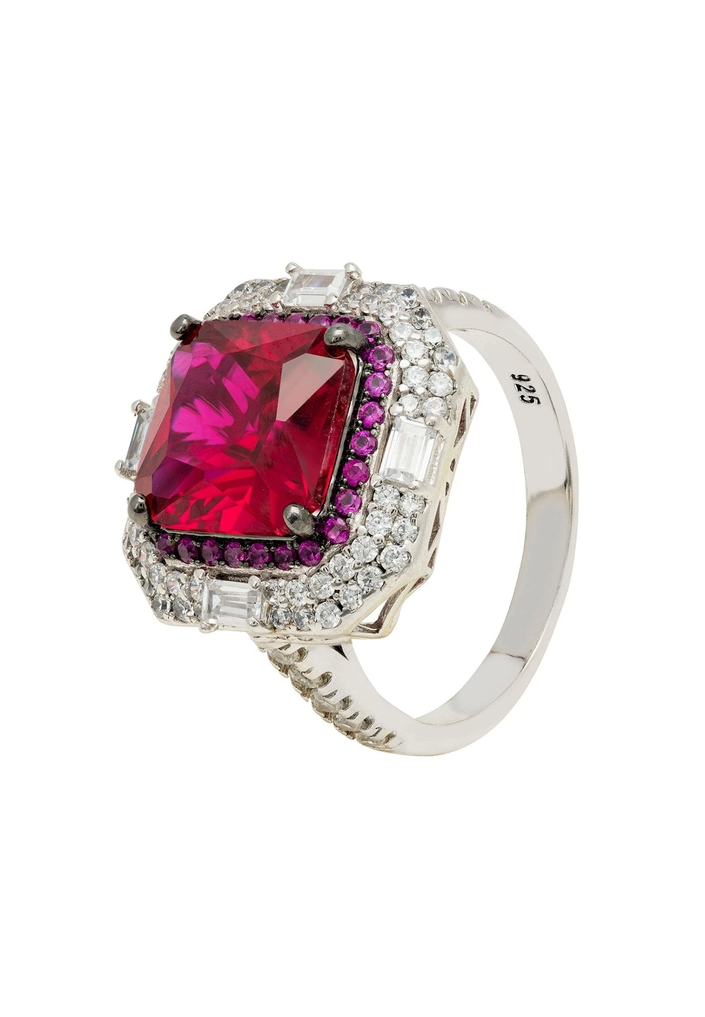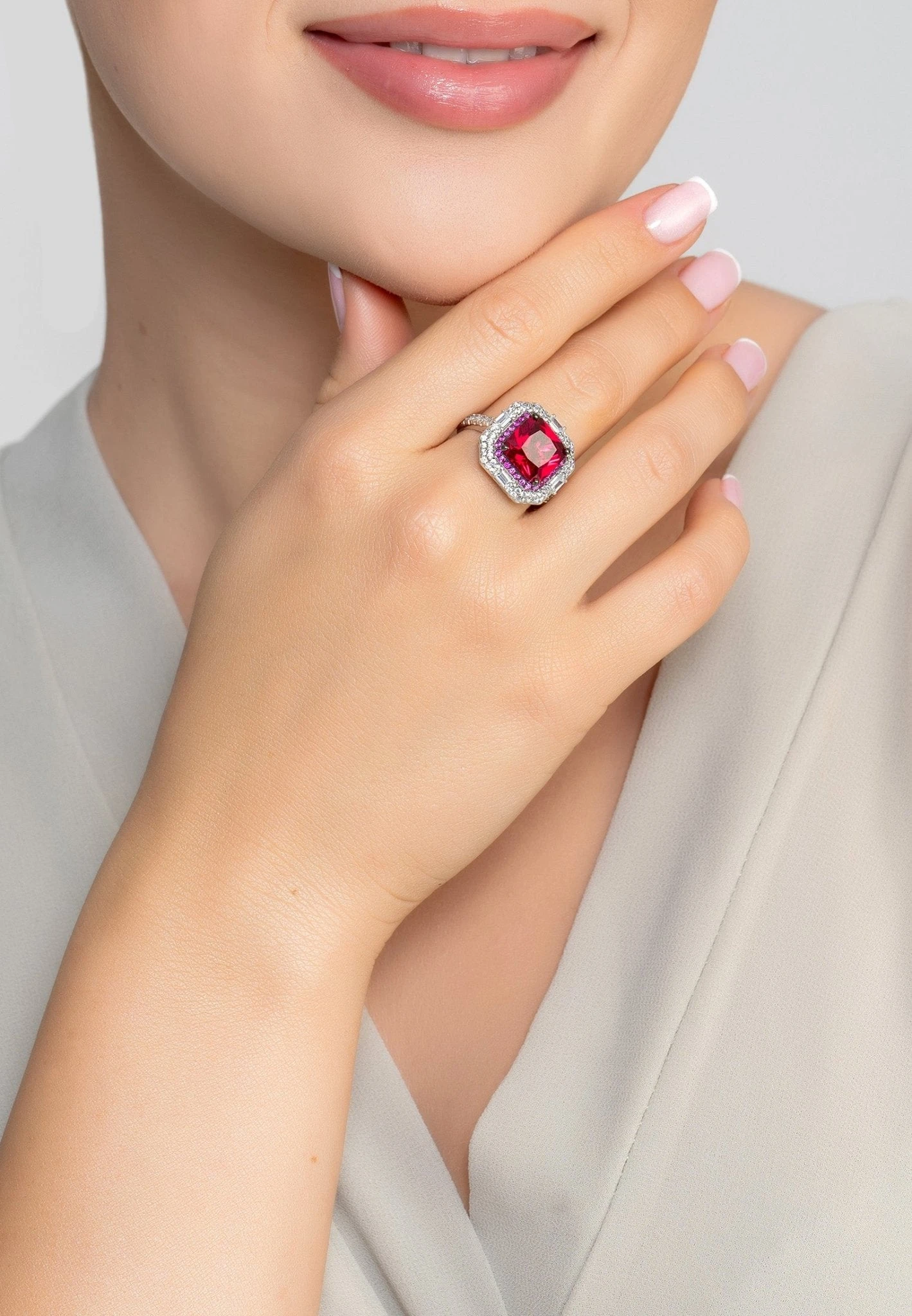 Introducing the Anastasia Gemstone Cocktail Ring. This stunning piece features a square shaped ruby centre stone framed by red cubic zirconia, with a double row of sparkling simulated diamonds around the outer edge for extra bling!