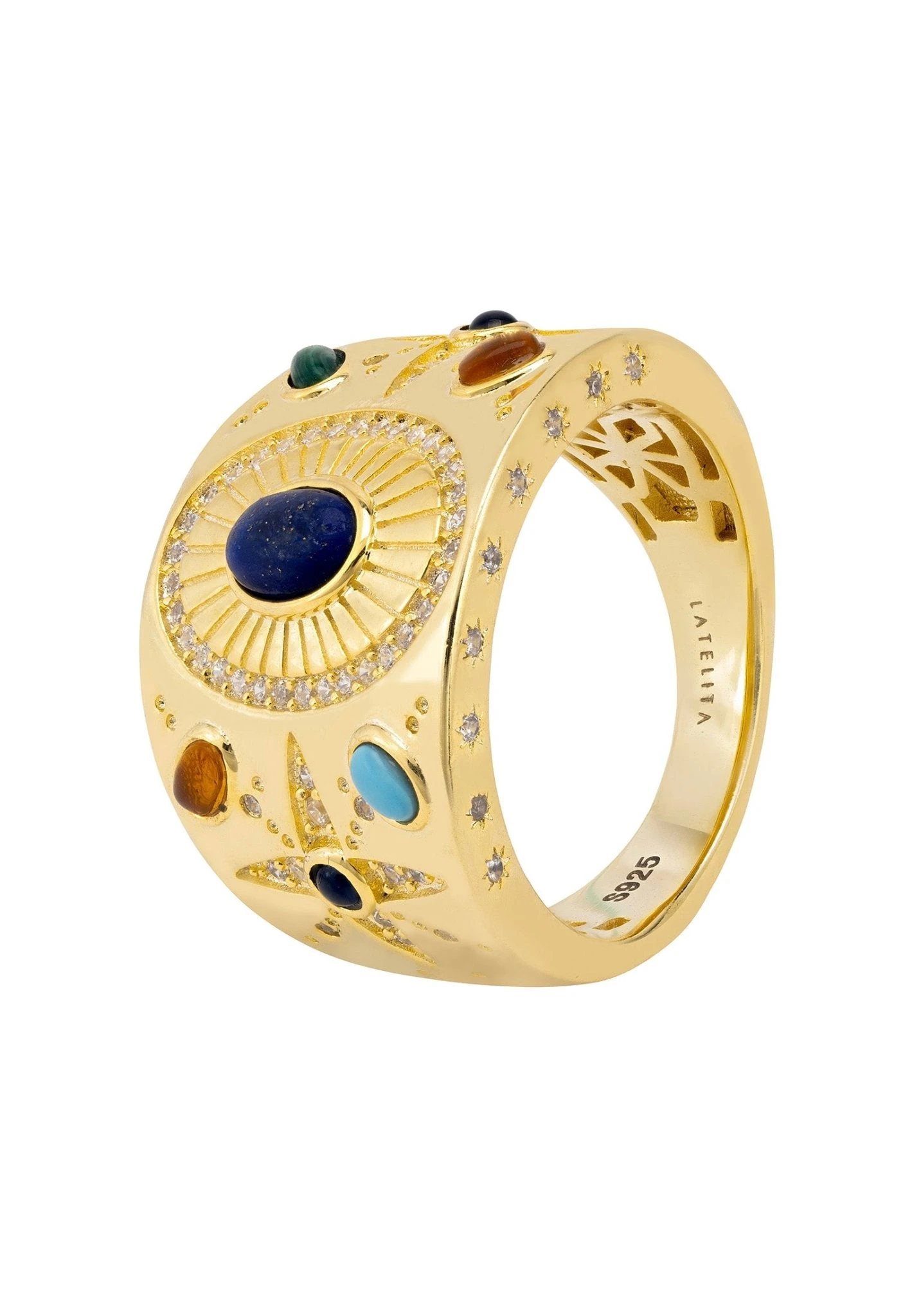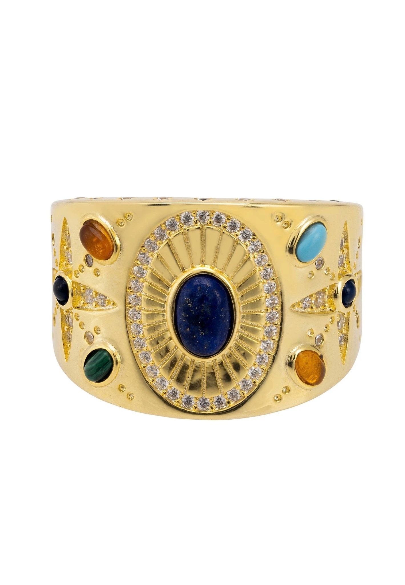 The Anubis ring is crafted in 925 sterling silver dipped in 22ct gold with seven beautiful oval gemstones in a rich palette of colours. Green malachite, dark blue lapis lazuli, yellow citrine, and turquoise are all used to create a stunning effect. And the gold-plated finish is polished to a high shine and etched with intricate patterns for added interest, accented with sparkly cubic zirconia. Even the inside of the ring has not been overlooked and is decorated with a pretty cut-out floral design.