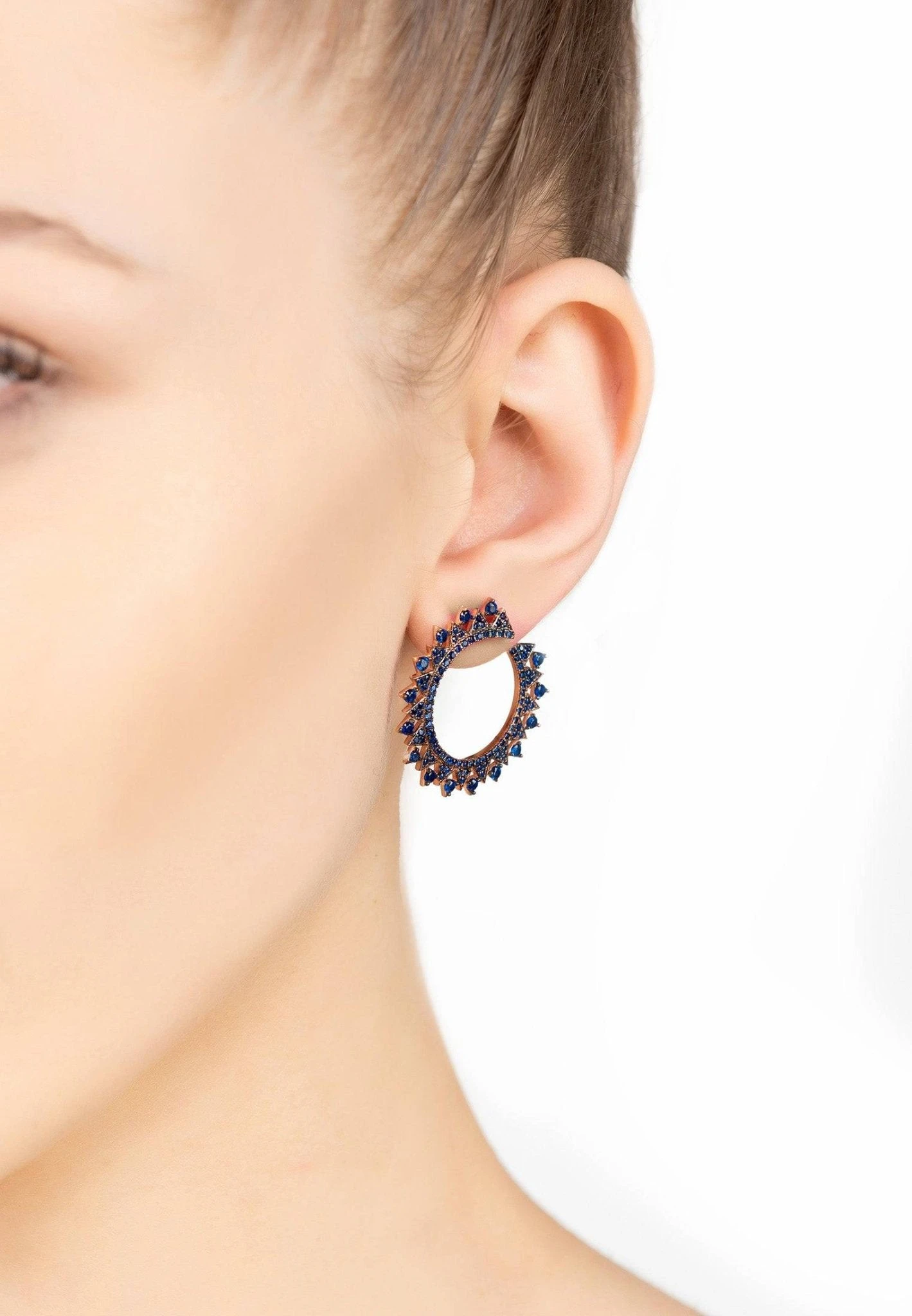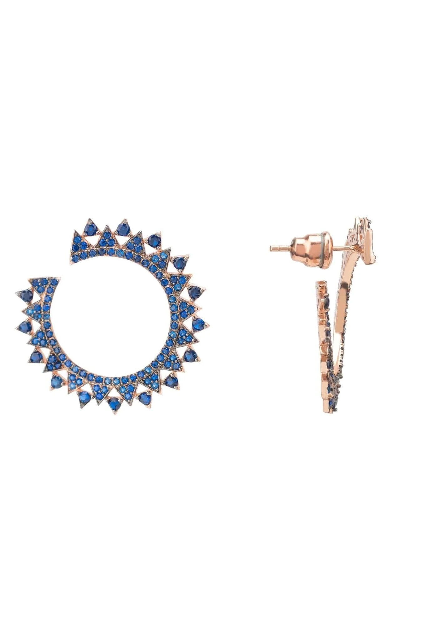 Hand crafted in sterling silver, these hoop earrings have a spikey outer edge, reminiscent of the rays of the sun, adorned along the sweep of the hoop with sparkling sapphire blue zircons.