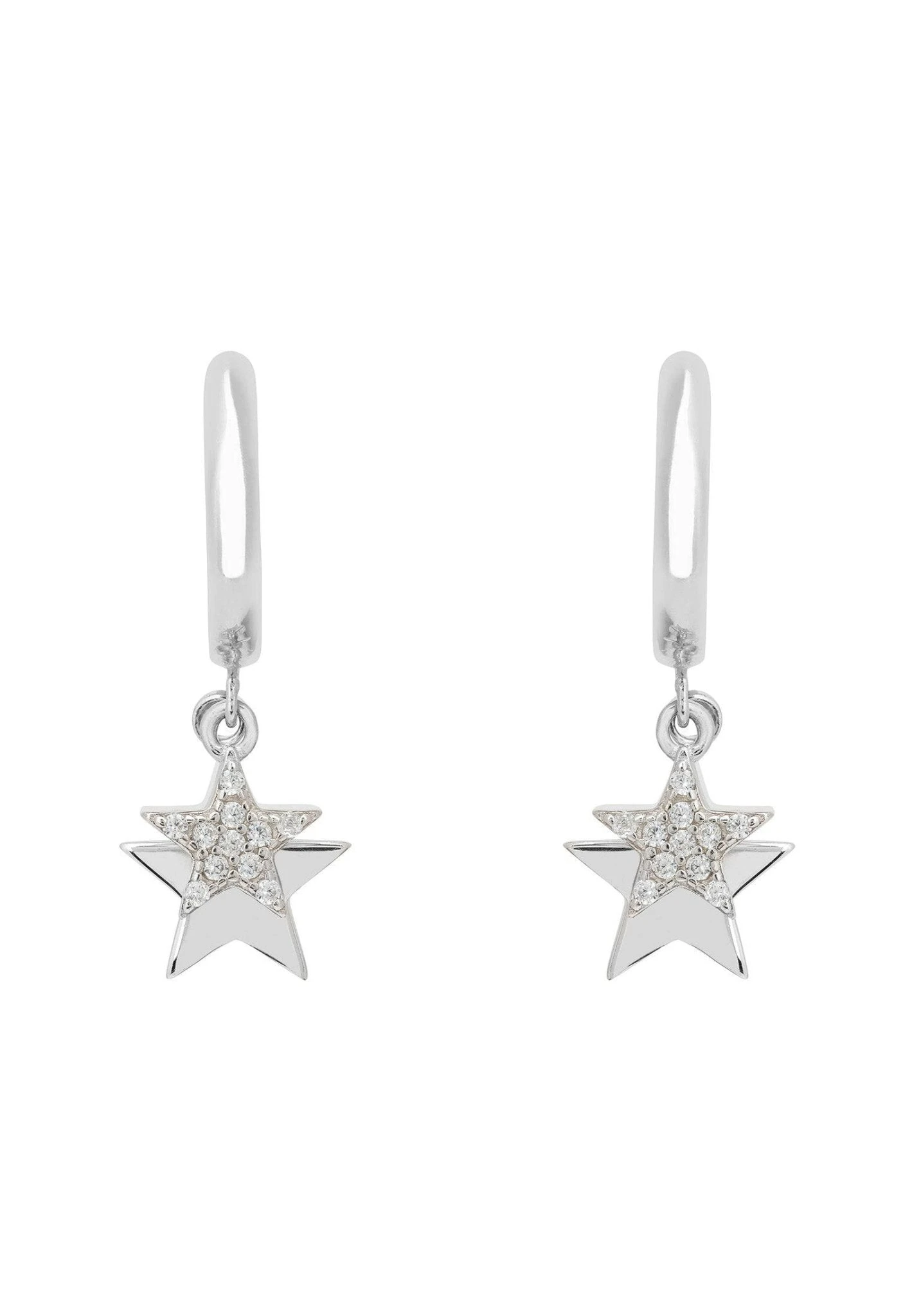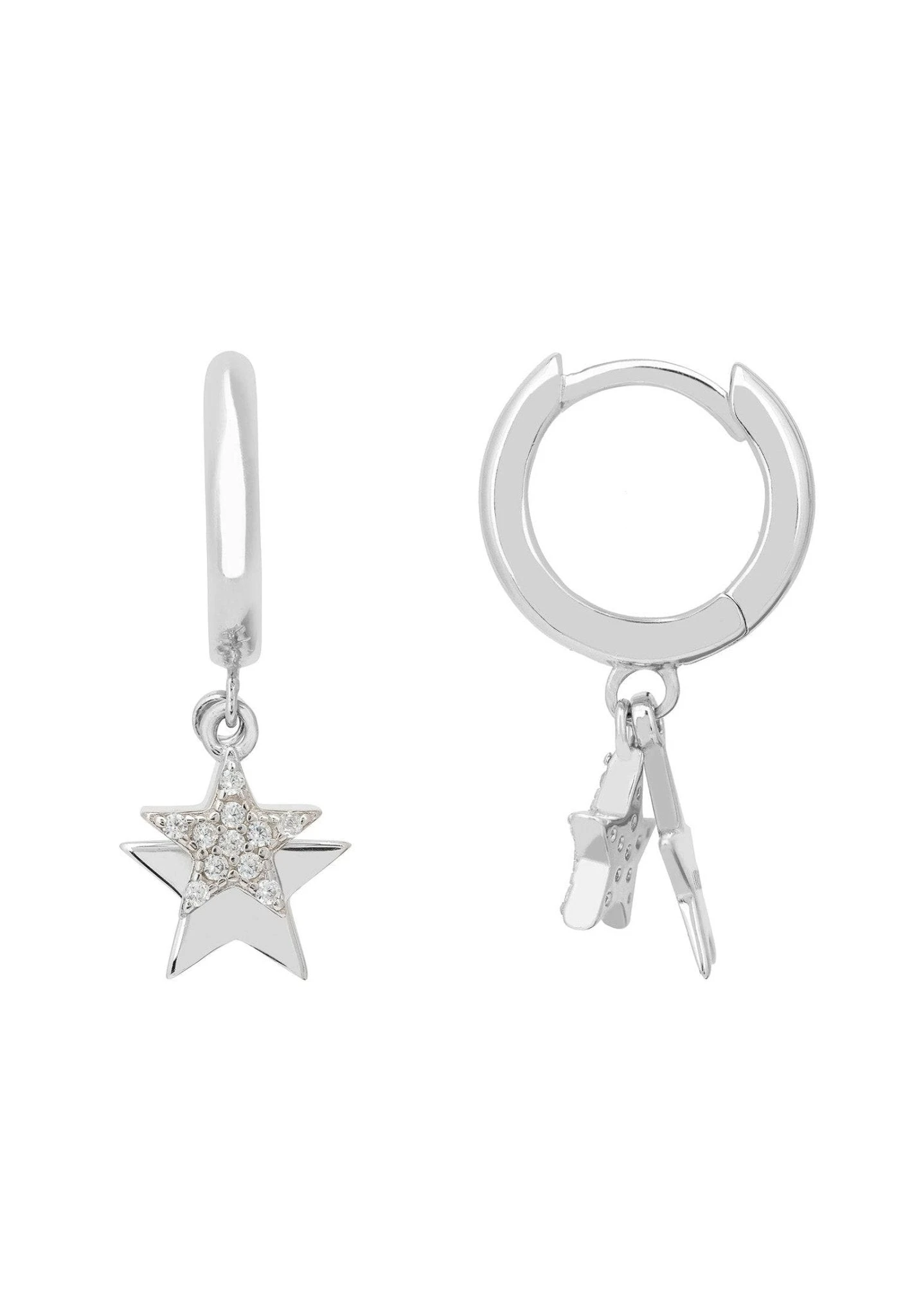 Pretty and petite, these hoop earrings have two small star motifs that hang from the base of the hoop. One set with white zirconia and the other in a highly polished metallic finish. These pretty hoops are hinged for ease of application and hug the earlobe for an elegant, understated aesthetic making them perfect for those who covet delicate jewellery with added sparkle.