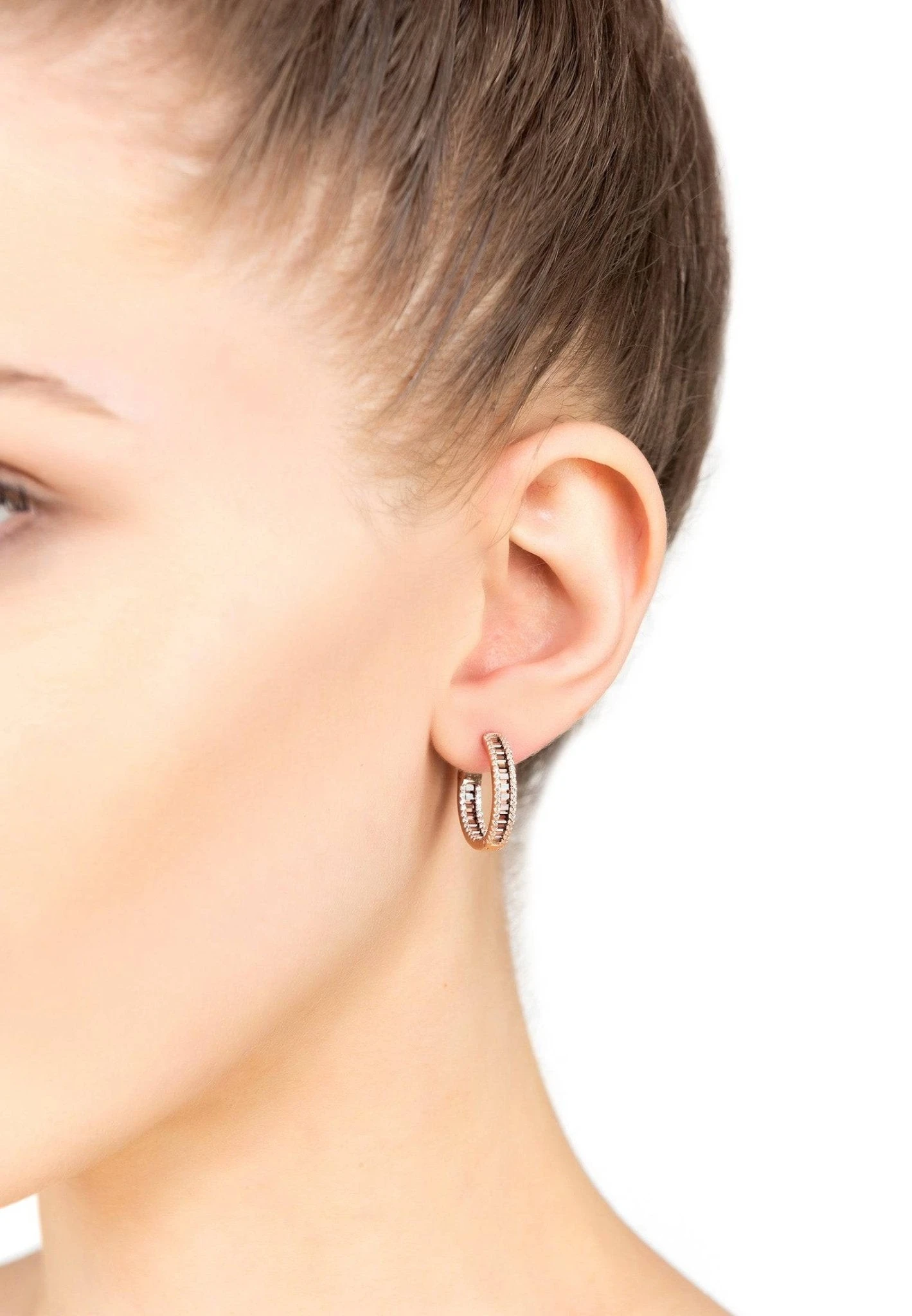 These beautiful baguette hoop earrings are stylishly simple with added sparkle. A block colour of baguette cut zircon adorn the circumference of this stunning hoop, edged on either side with sparkling white zircons for even more glitz and glam.