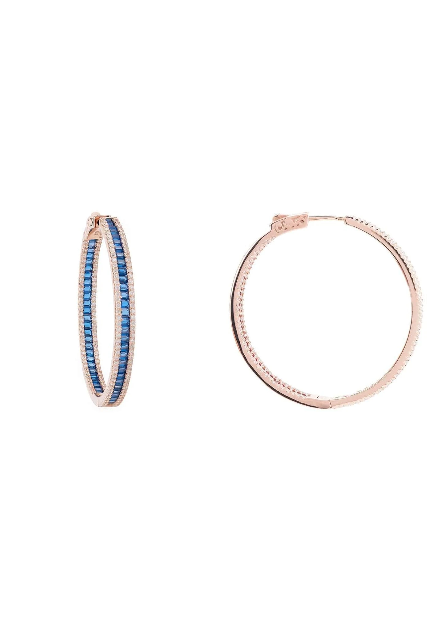 These beautiful baguette large hoop earrings are stylishly simple with added sparkle. A block colour of baguette cut zircon adorn the circumference of this stunning hoop, edged on either side with sparkling white zircons for even more glitz and glam.