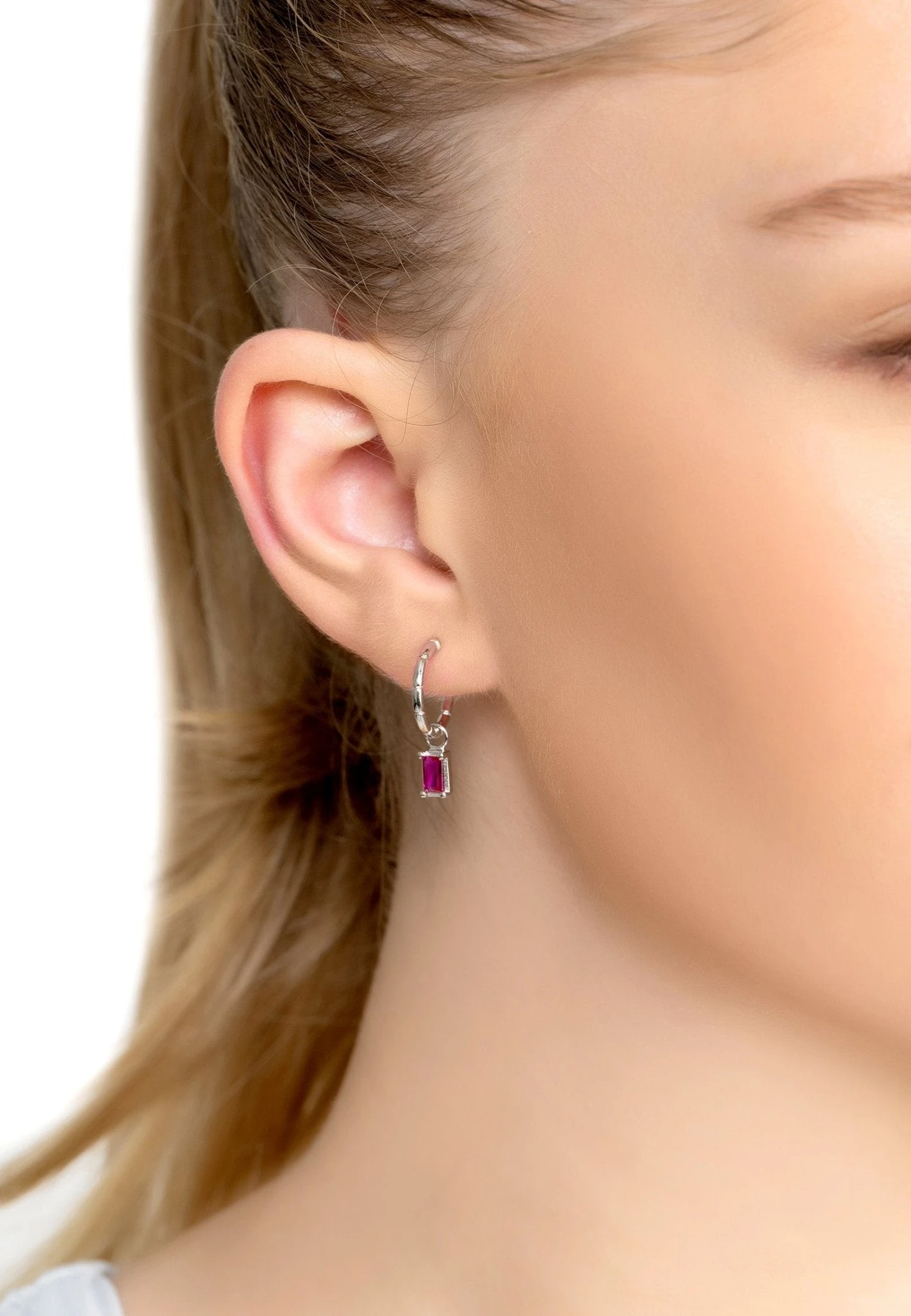 A small, detachable, rectangular lab-created gemstone dangles provocatively below the hoop for a little shimmer of colour. But if some days you feel like a change, just take off the gemstone and enjoy a plain hoop. It’s fastened by an easy post fastening, so you won’t be fumbling trying to put them on but they will feel secure in your ears.