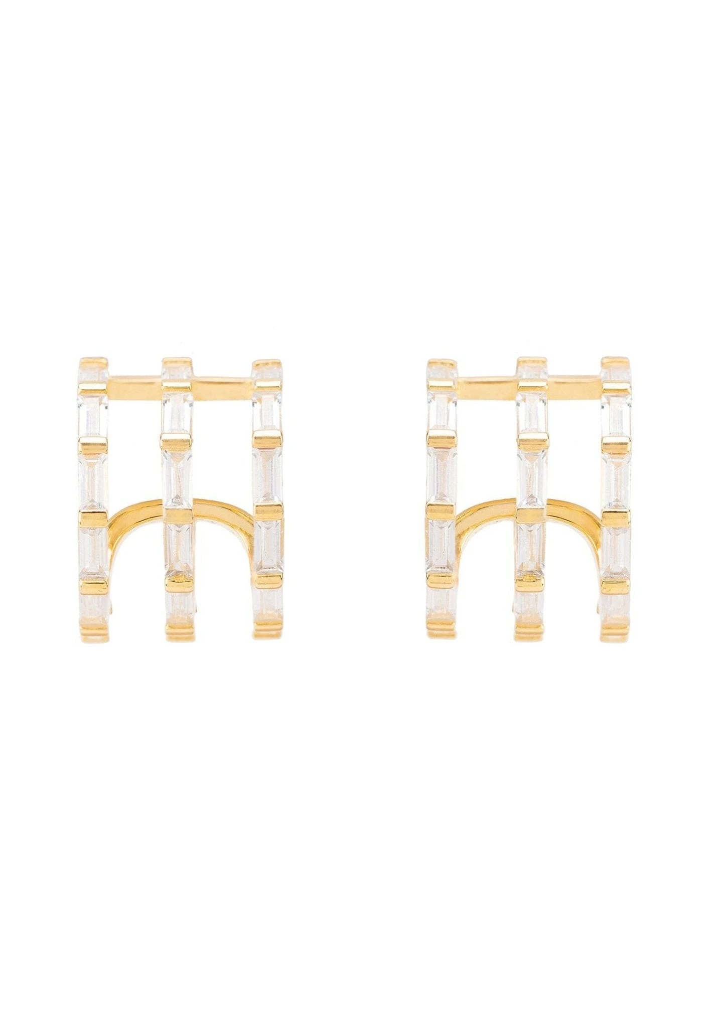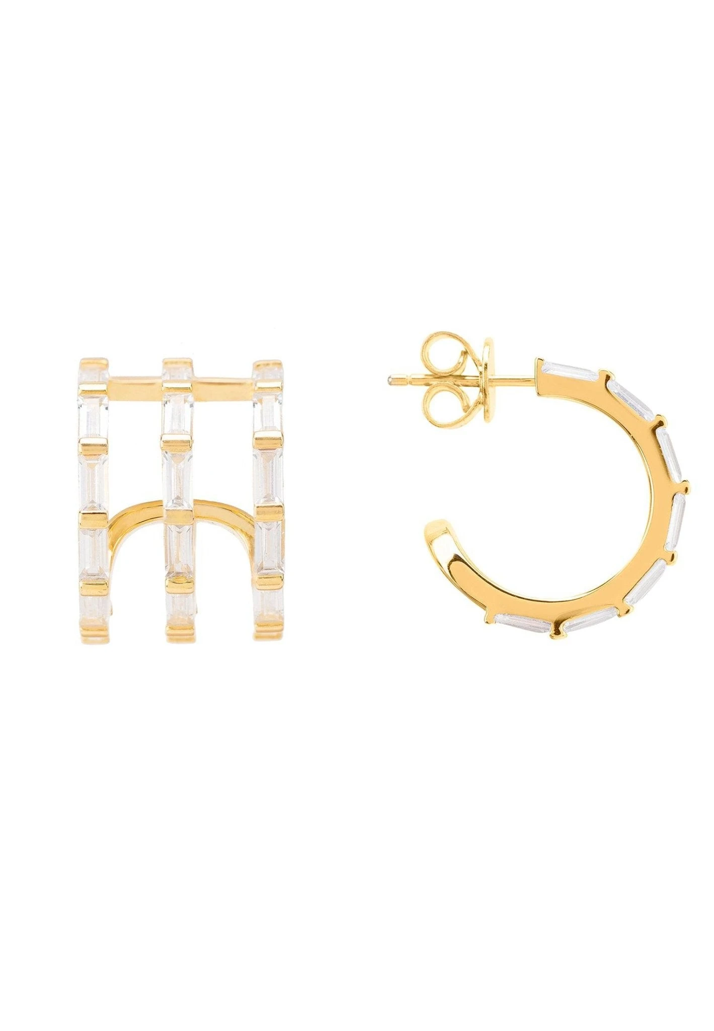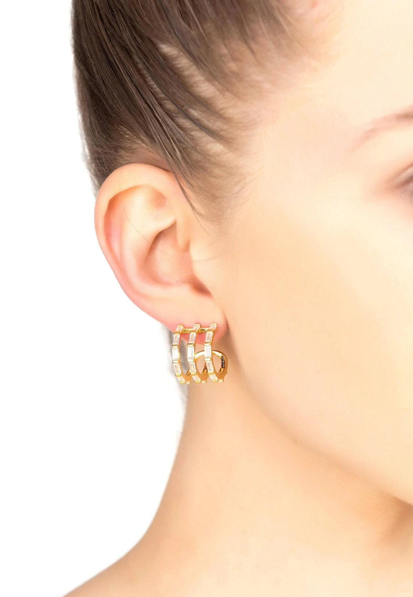 These hoop earrings may be small in diameter but they make up for that with their width. The design of these earrings boasts three separate hoops, spaced evenly apart, creating a wide hoop earring that sparkles and shines with an abundance of baguette cut white zircons. Designed to sit close to the ear.