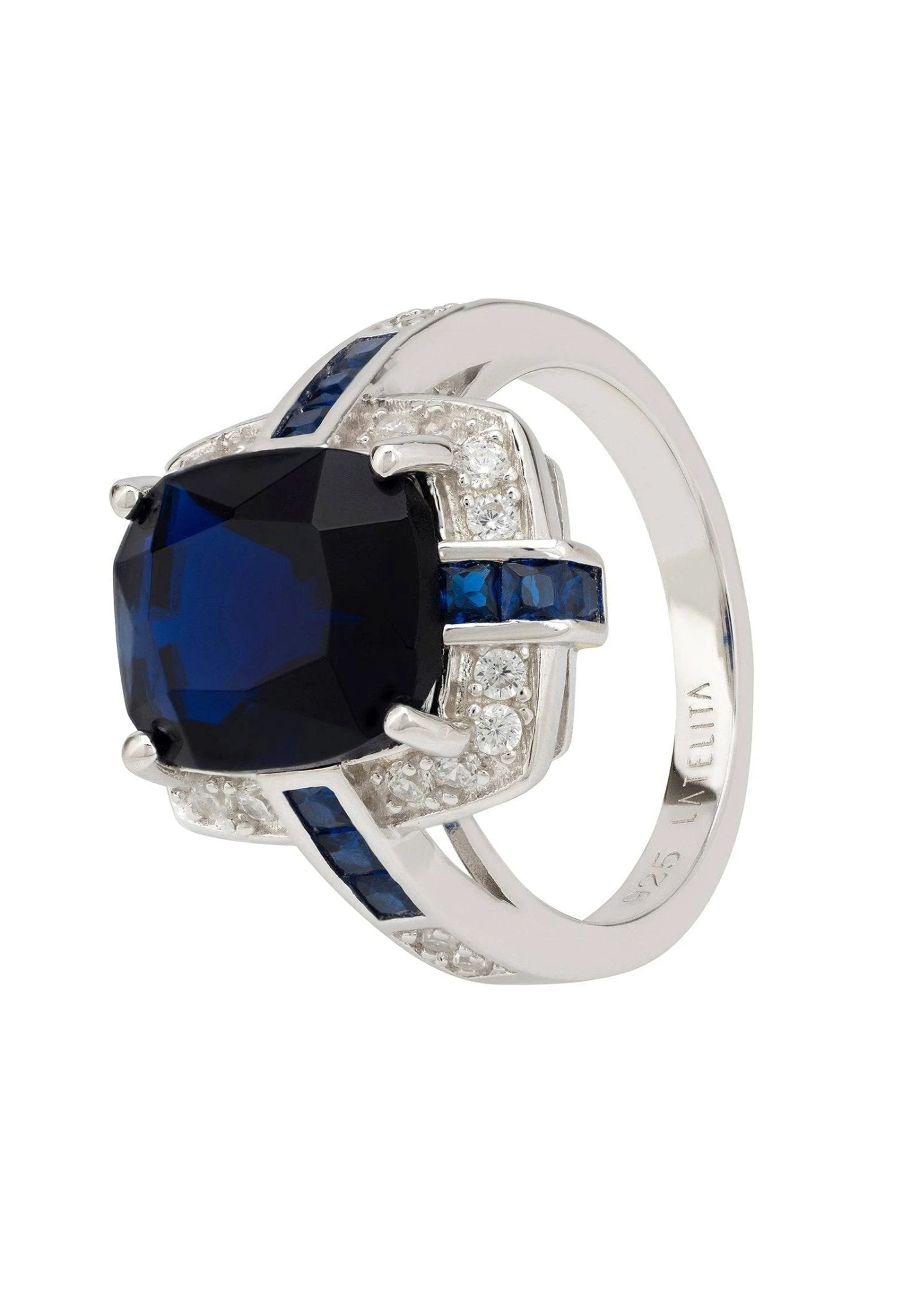 The beautiful design of the Clarence ring, features white zircons and cushion cut sapphires on the shoulders of the ring, holding aloft a beautiful oblong shaped cultured sapphire, surrounded in its setting with even more white zircons and cushion cut sapphires for added sparkle and glitz.