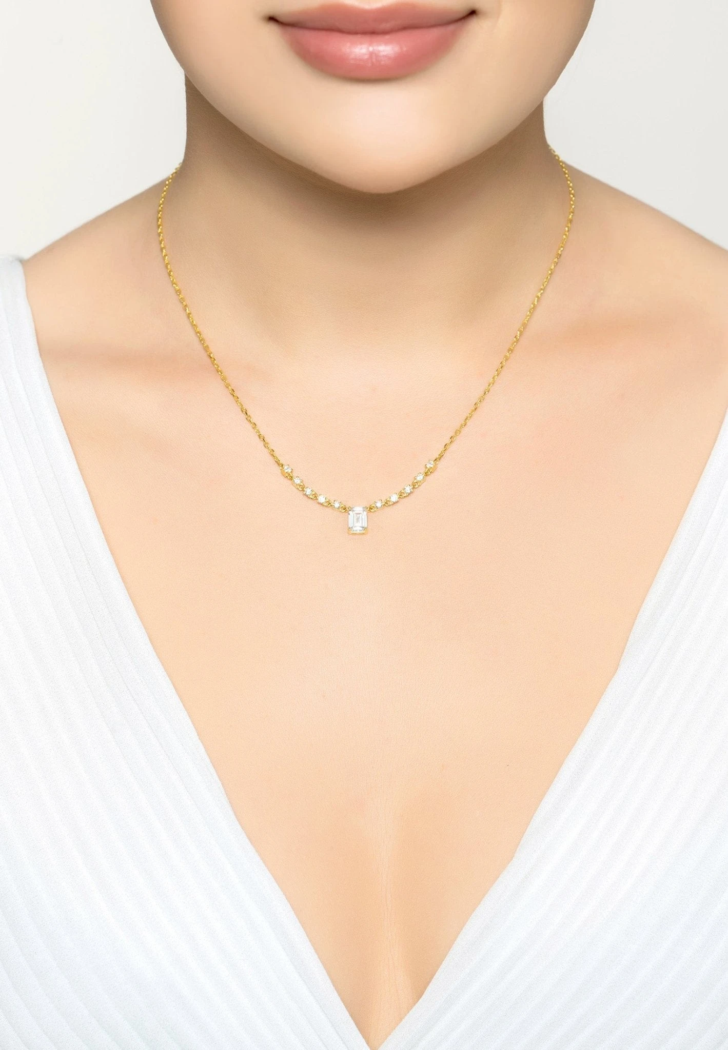 Introducing our Claudia Gemstone Pendant Necklace Gold, the perfect accessory for any stylish outfit. This stunning pendant necklace features a shimmering and eye-catching gemstone centre stage. Handcrafted with quality 925 sterling silver and beautifully plated with 18ct gold, this necklace is designed to look elegant but also show off some fashion-forward style. The small gemstone measures 0.7cm by 0.5cm and is set off perfectly by cubic zirconia running along the front aspect of the chain of this necklace, adding a timeless sparkle that will have heads turning in admiration.
