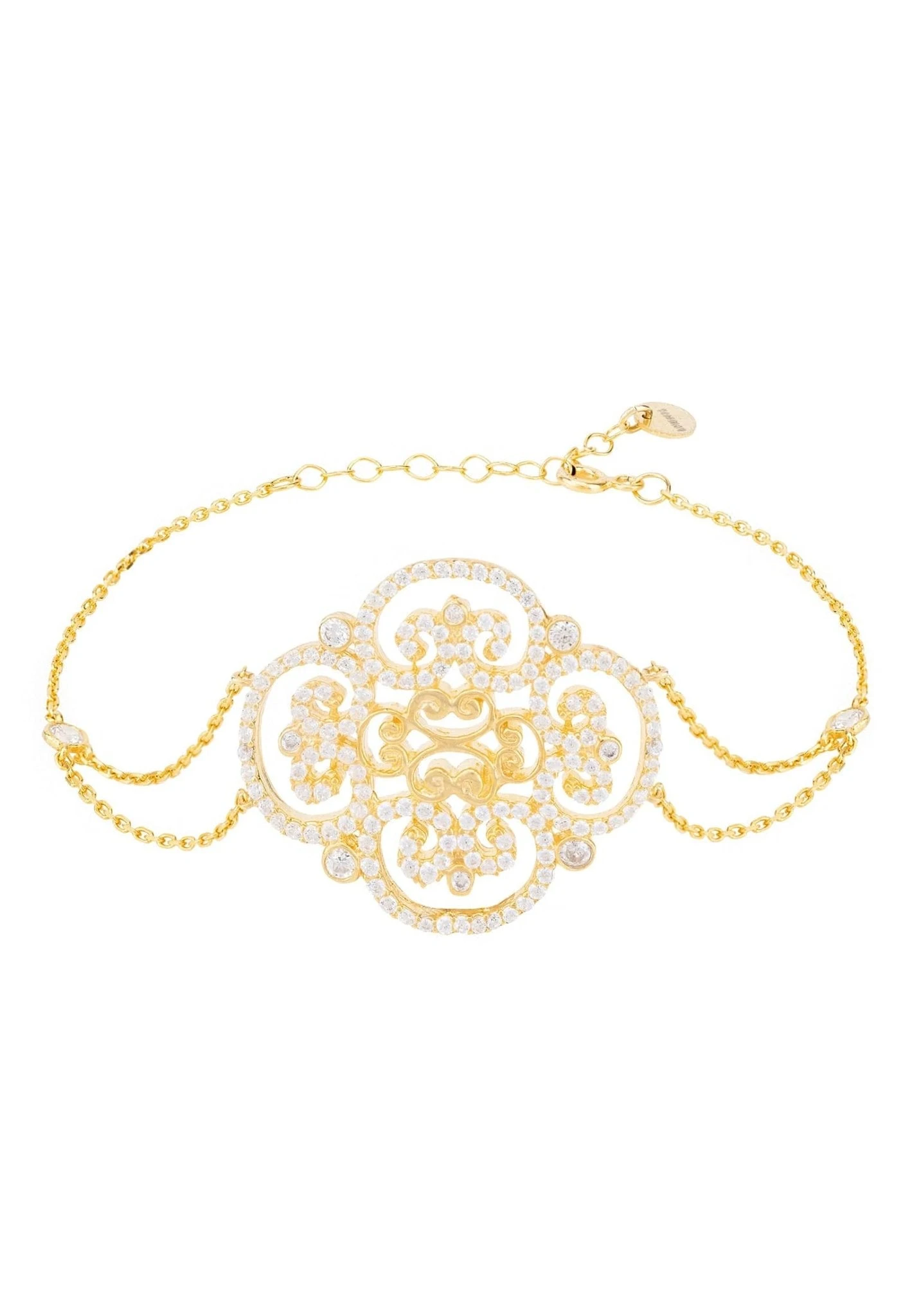 This bracelet features a clover motif with an open filigree pattern adorned with Latelita signature zircon detailing, set on a double chain bracelet framed either side with a larger single zircon where it tapers to a single chain.