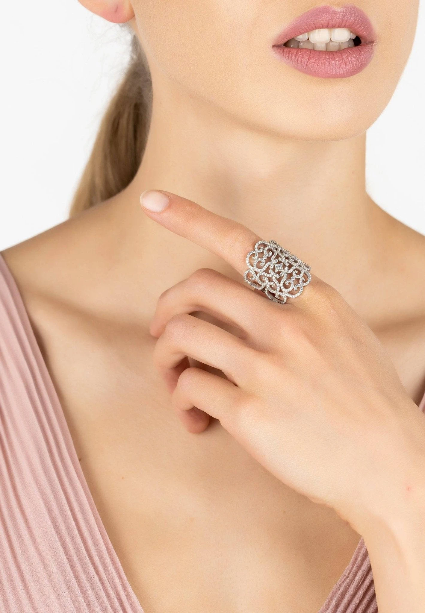 Ideal for those who adore statement jewellery. This stunning ring features scrolls of filigree work adorned with sparkling zircons that, when worn, hugs around the finger to dazzle and shimmer.