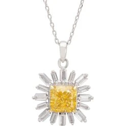 The beautiful 925 sterling silver pendant has a sparkly square Citrine gemstone in the centre, surrounded by petals of glitzy baguette cut zirconia. The necklace comes on a delicate 42-45cm chain which can be adjusted to suit your neckline. Why not complete the look with the matching earrings for a coordinated ensemble.