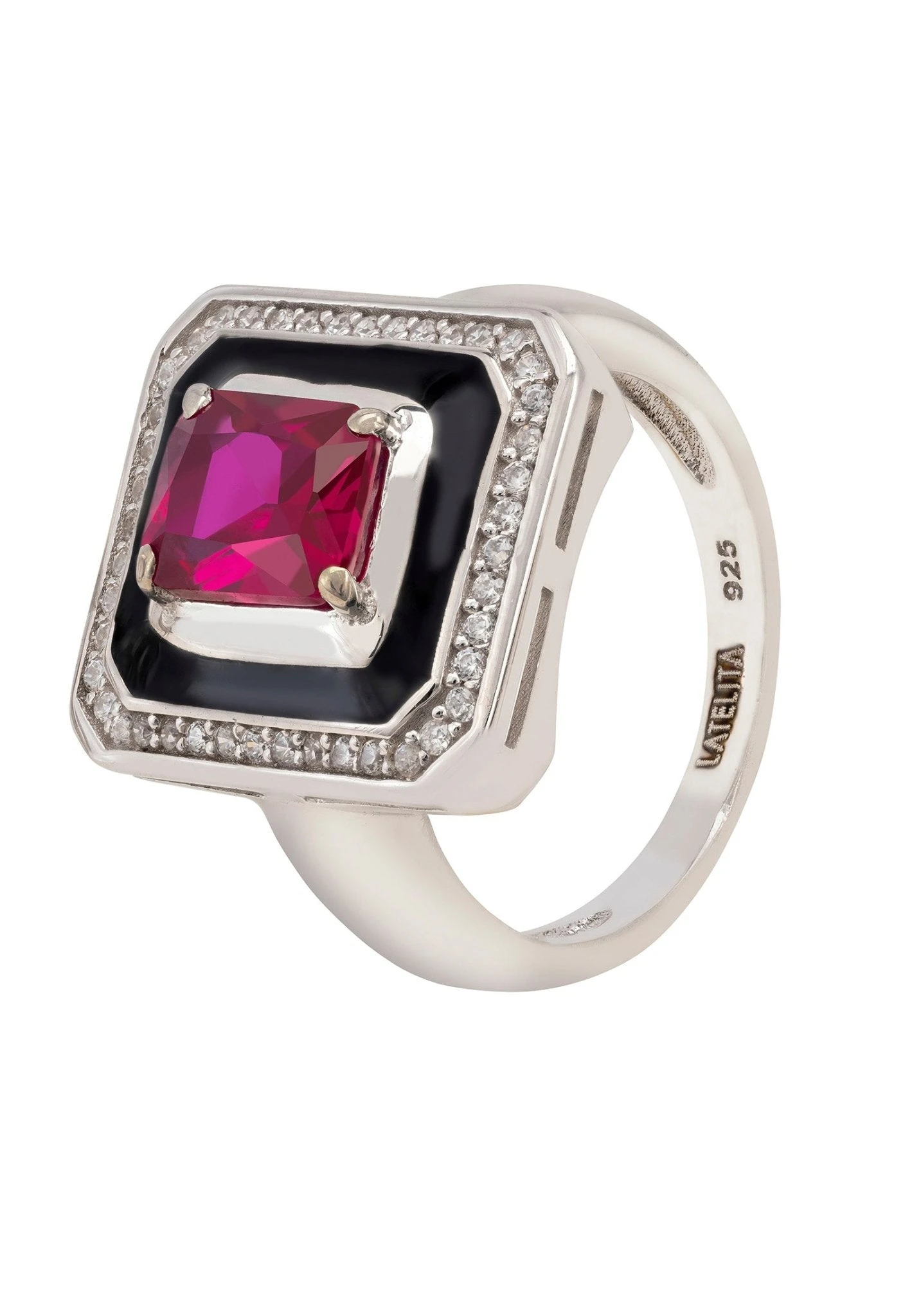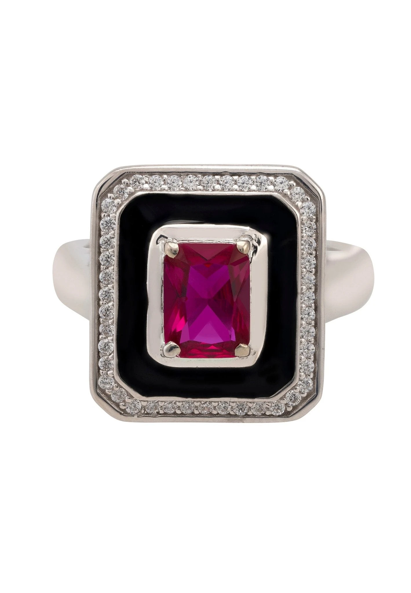 This stunning cocktail ring is handcrafted from 925 sterling silver. Geometric shapes and bold colours give this ring a dazzling look of elegance and style. The central ruby is set off by the black enamel background and surrounded by white cubic zirconia.