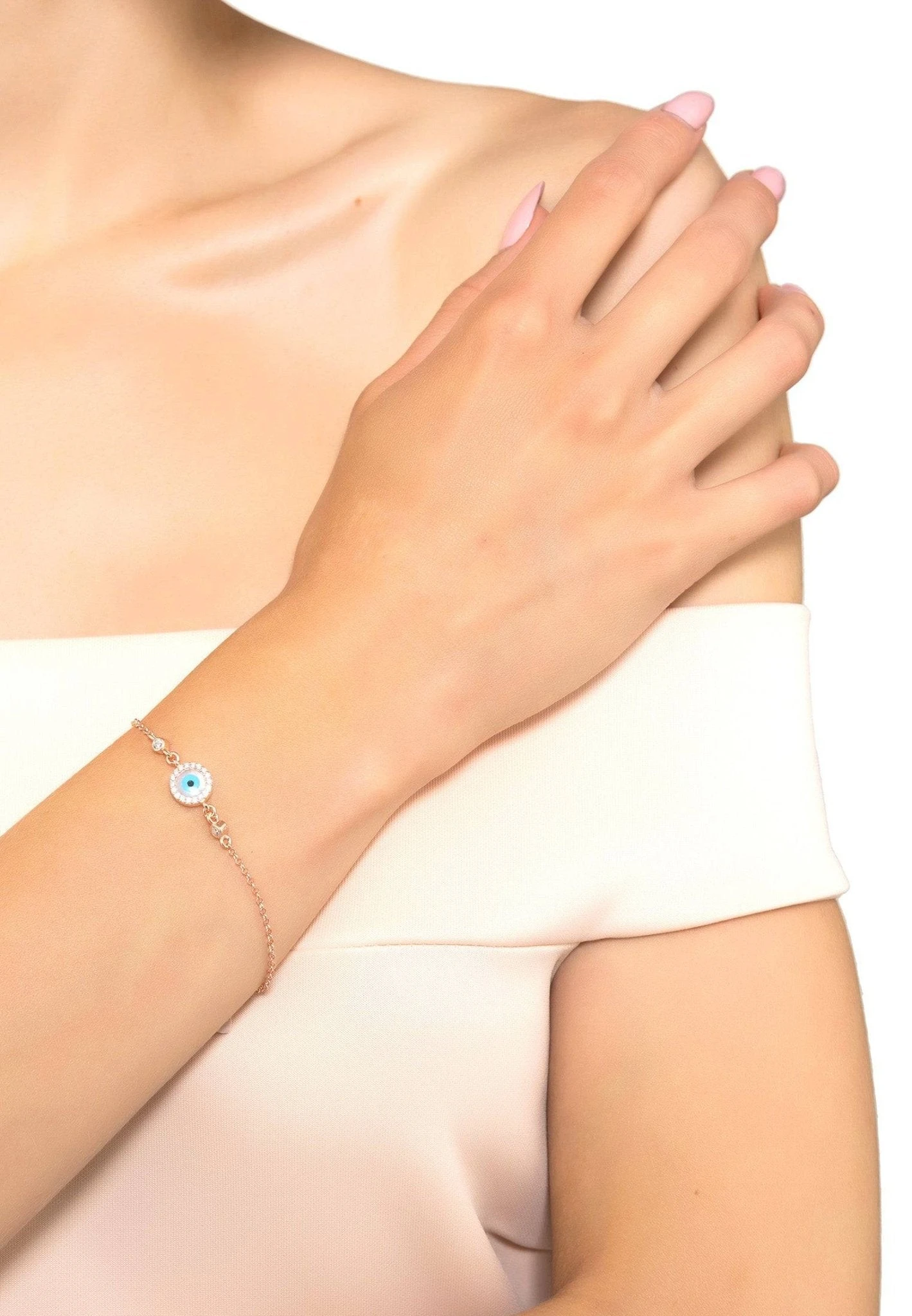 If you’re looking for an ultra-chic jewellery piece to complete your look, our Evil Eye Round Mother of Pearl Gemstone Bracelet is the perfect choice. Handcrafted with sterling silver dipped in 22ct rosegold and adorned with faceted white zircons, this delicate bracelet is the ideal way to make a statement without overpowering your outfit.