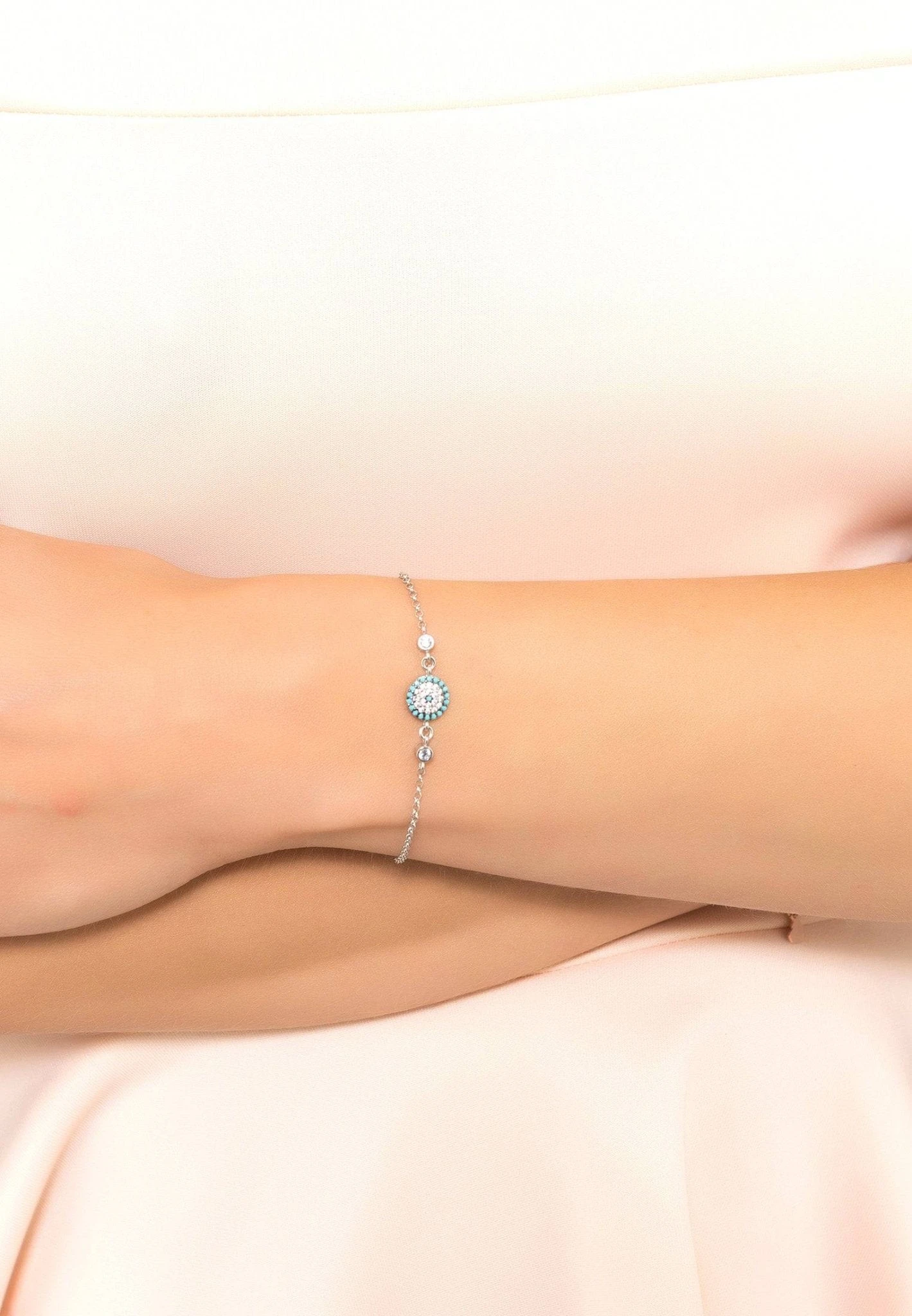 Handcrafted in sterling silver, each bracelet is adorned using Latelita London multifaceted white and turquoise zircons, framed either side of the evil eye motif with a single, larger white zircon to provide dazzling sparkle from day to night.