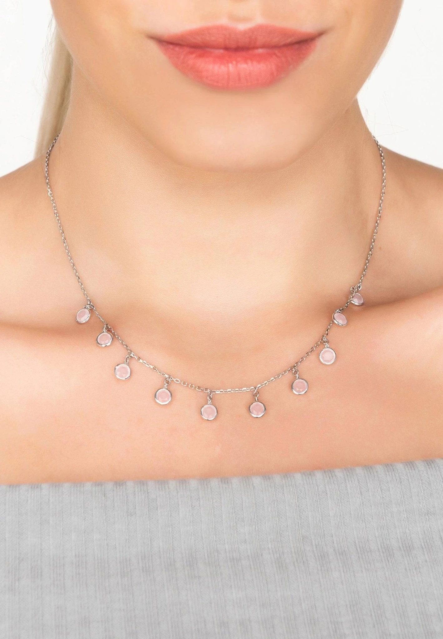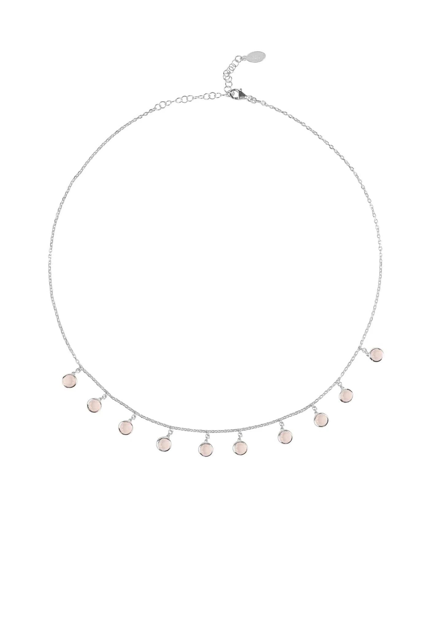 The Florence round gemstone necklace silver rose quartz is a beautiful and stylish piece of jewellery that sparkles and catches the light beautifully. This necklace features rose quartz gemstones in a feminine and stylish design, perfect for any outfit. The round cut gemstones are spaced evenly on a fine chain and are set in 925 sterling silver. The necklace also features a lobster clasp and size adjuster for ease of wear.