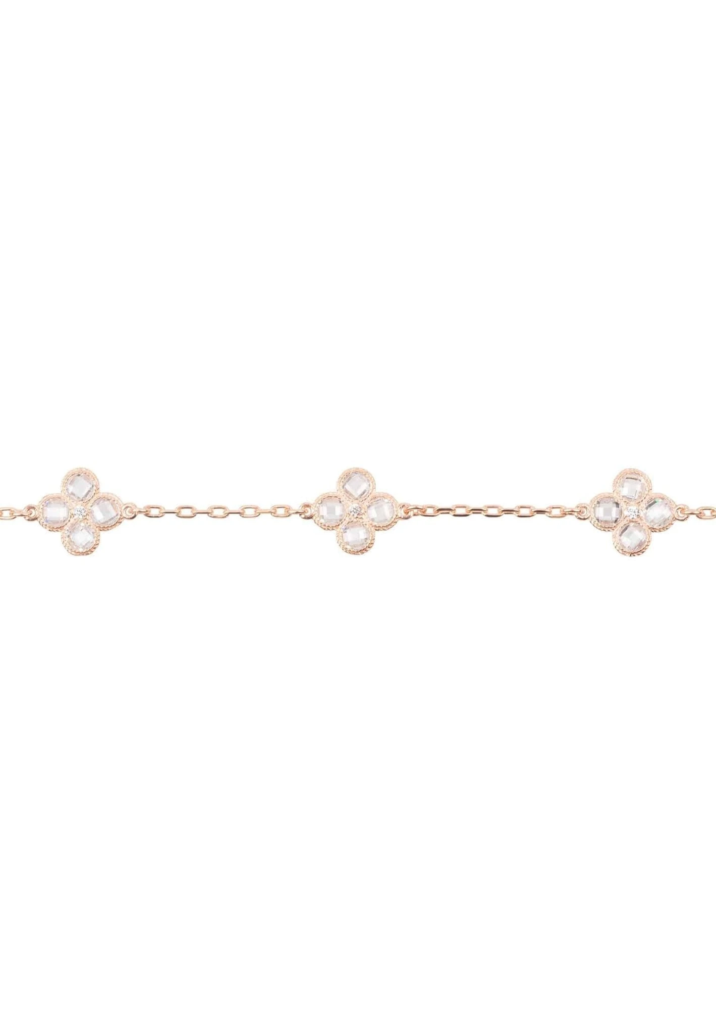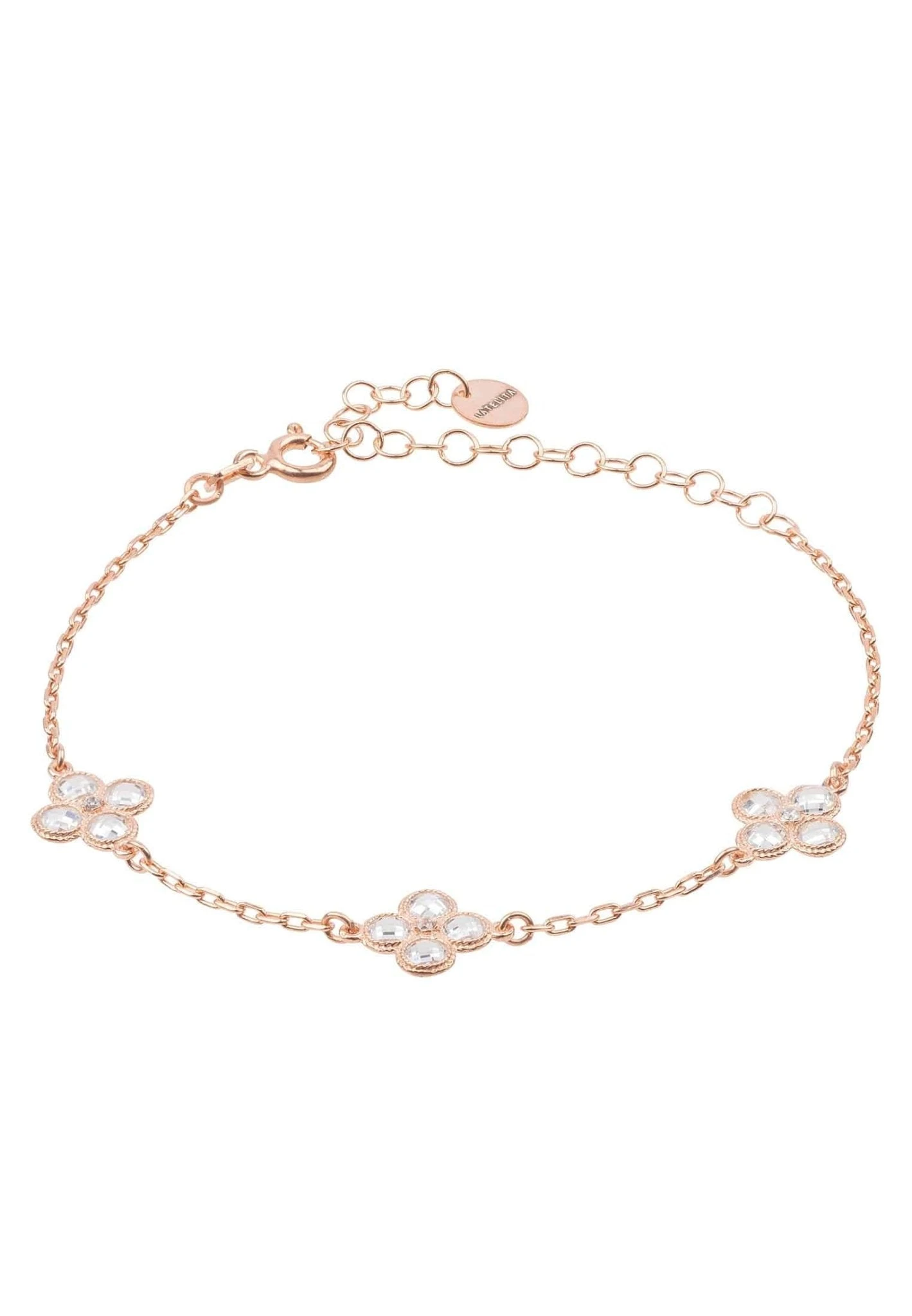 Want to welcome some extra sparkle into your wardrobe? Look no further than the Flower Clover Triple Bracelet, perfect for adding a touch of glamour to any outfit! With three flower clover motifs spaced along a 925 sterling silver chain that has been dipped in 22ct rosegold, this fashionable piece of jewellery is an ideal accessory to set off any evening look, wedding outfit or chic everyday wear. While the four beautiful white zirconia stones which form each flower clover provide exquisite detail and shine.