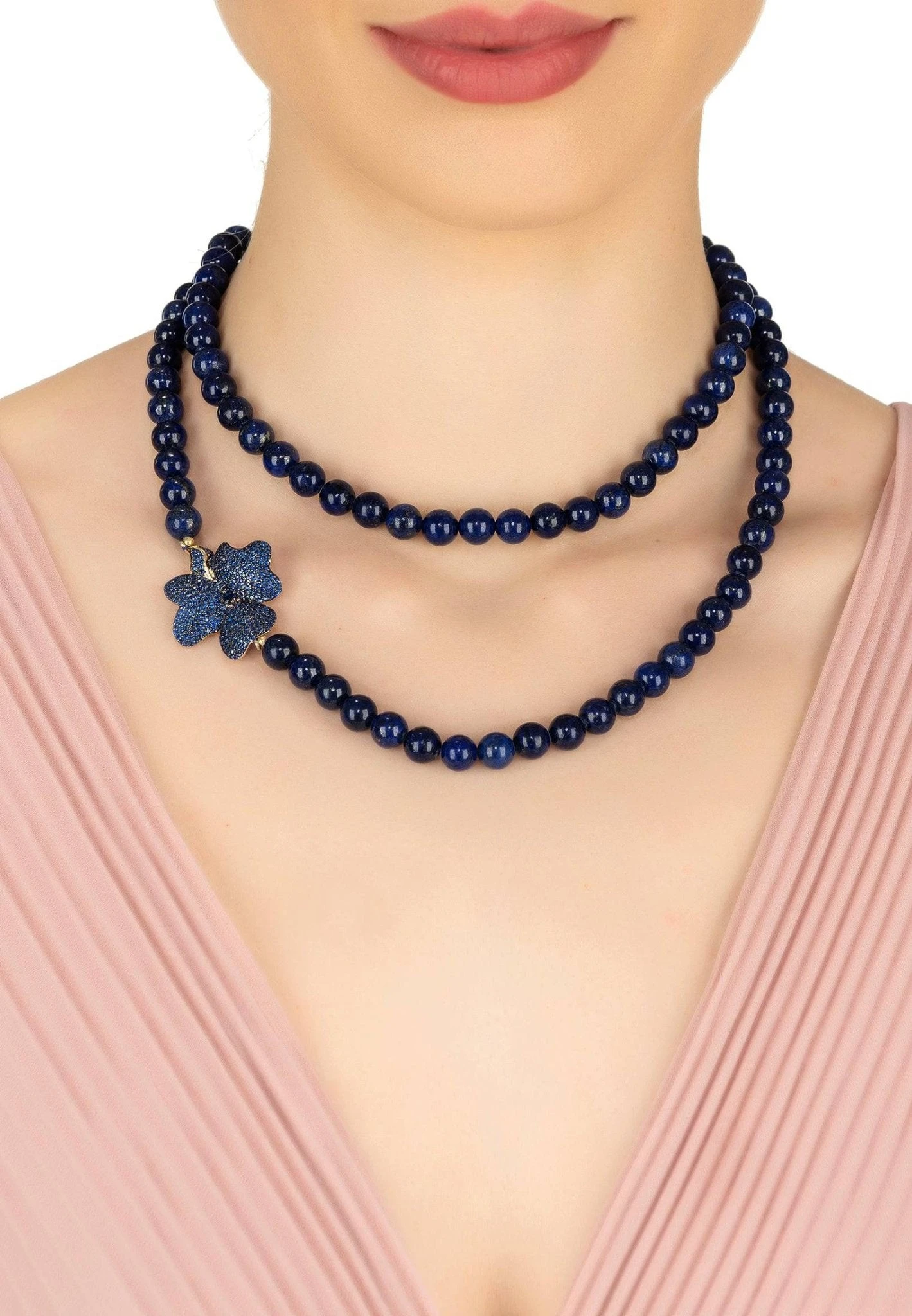 This long Lapis Lazuli gemstone necklace is ideal for those who adore colourful, statement jewellery. Make this stunning long gemstone necklace, which is adorned by a single zirconia encrusted flower, your new wardrobe staple.