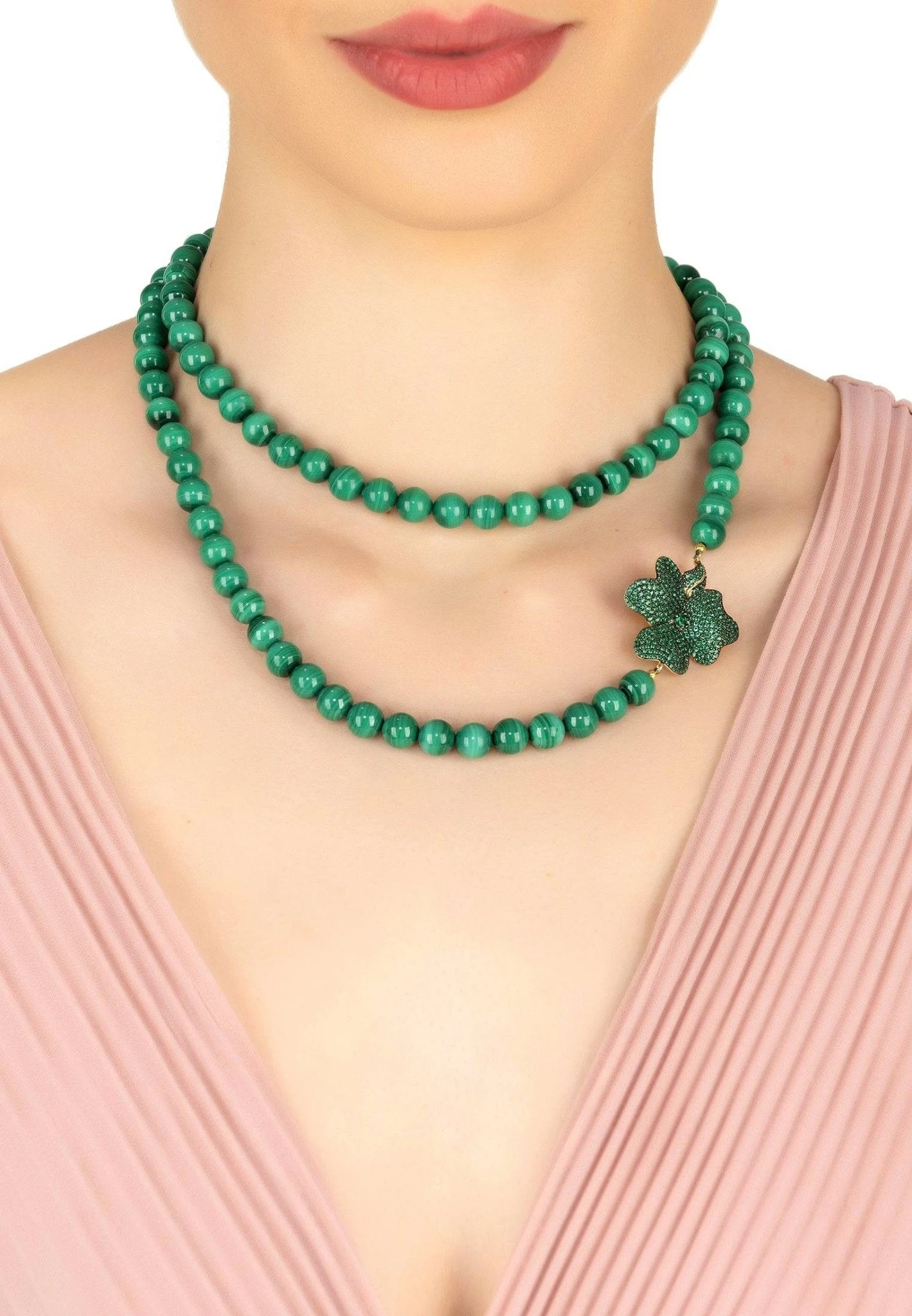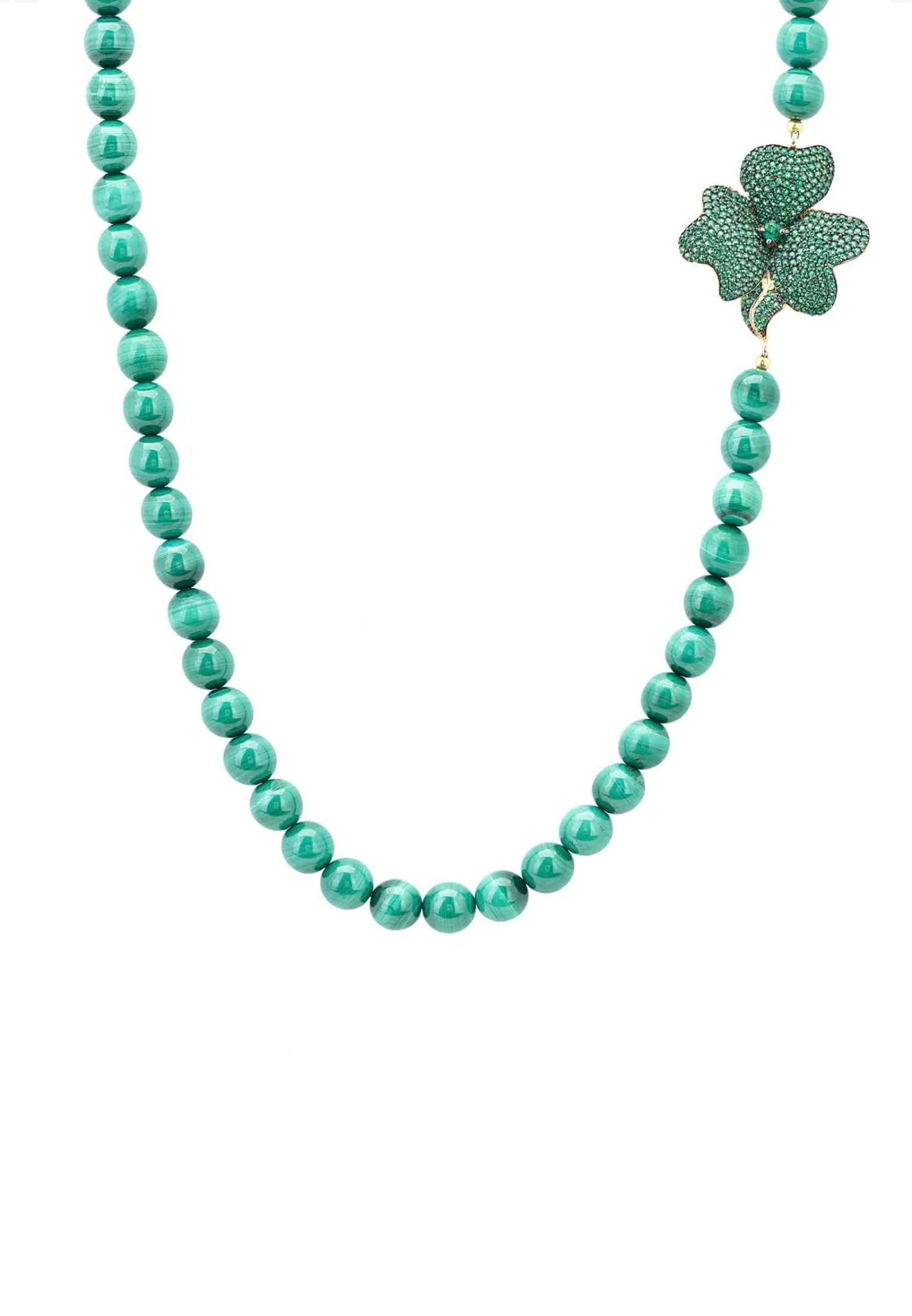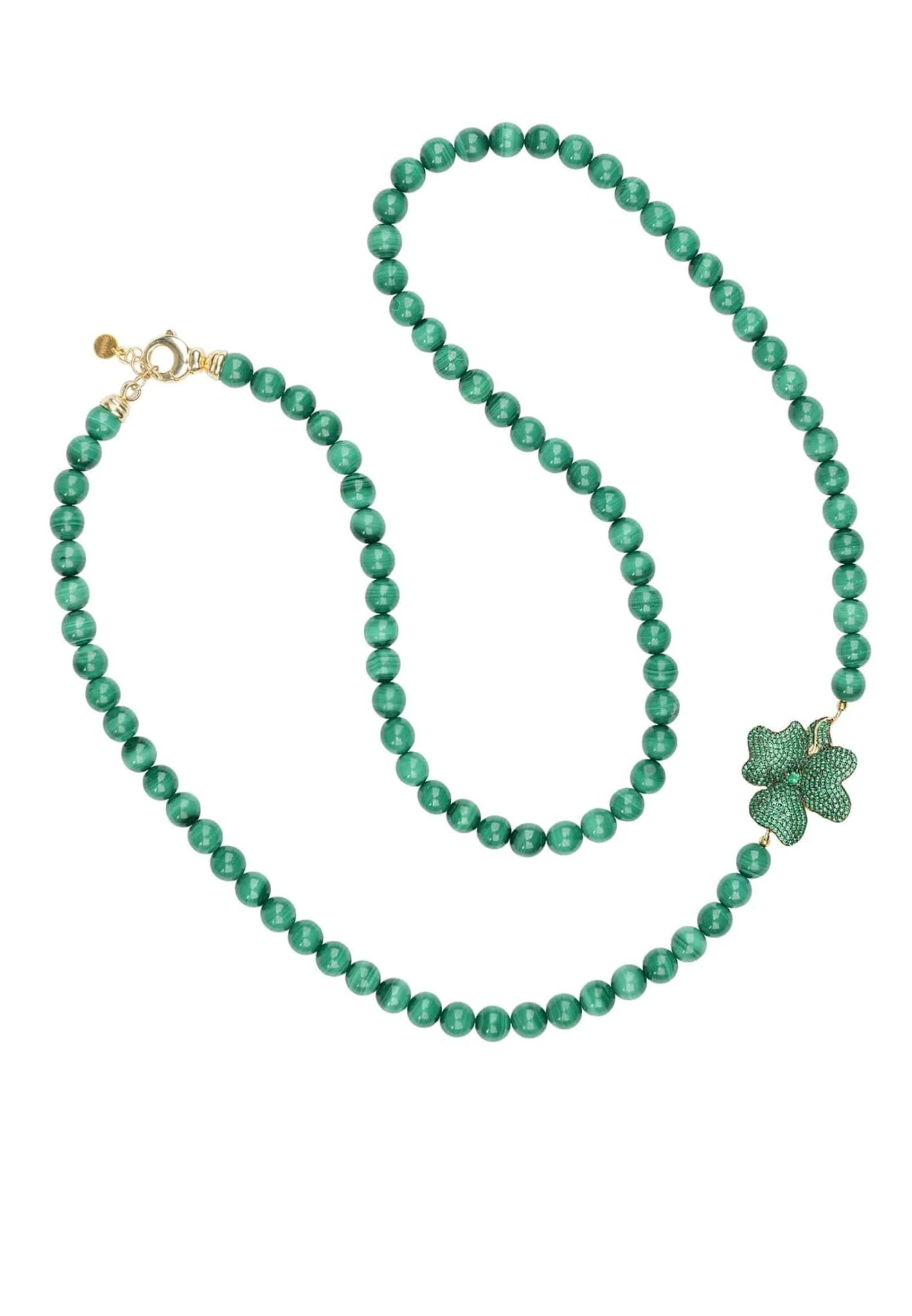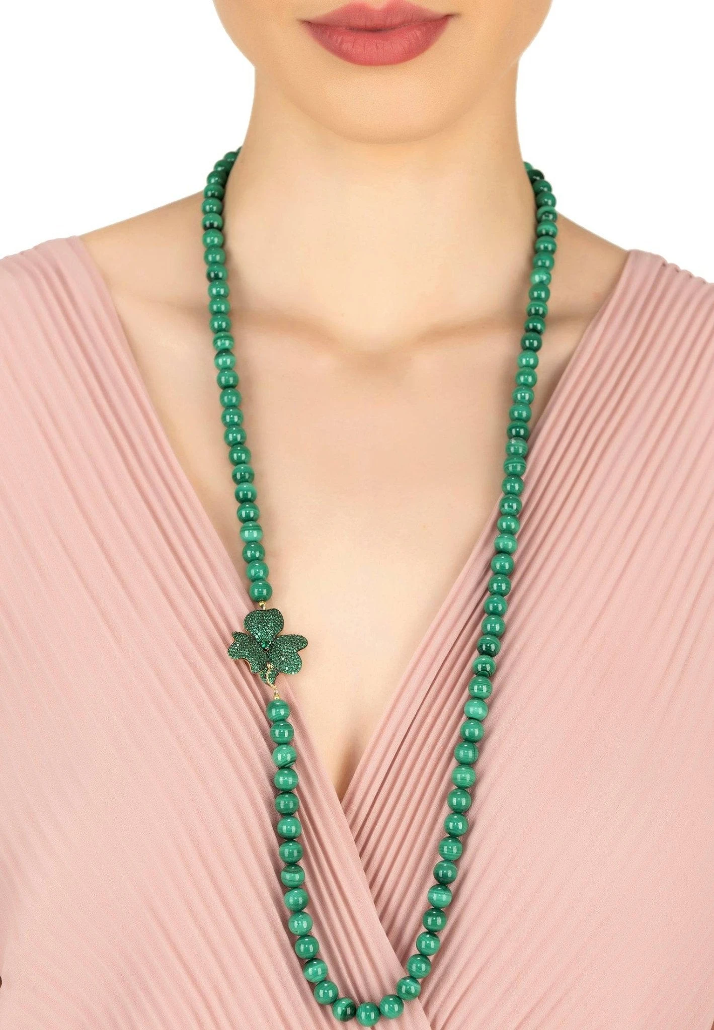 This long Emerald gemstone necklace is ideal for those who adore colourful, statement jewellery. Make this stunning long emerald gemstone necklace, which is adorned by a single zirconia encrusted flower, your new wardrobe staple.