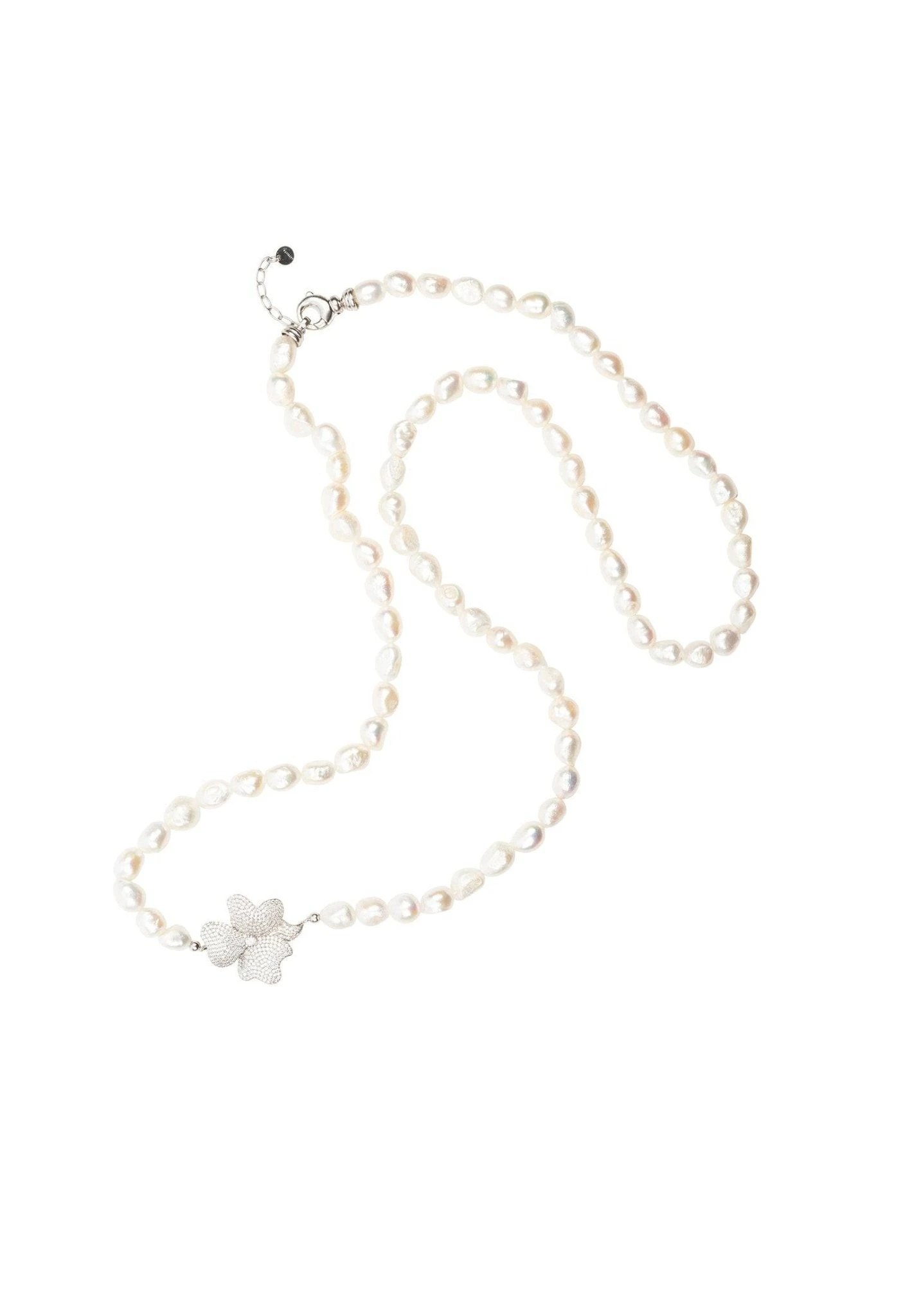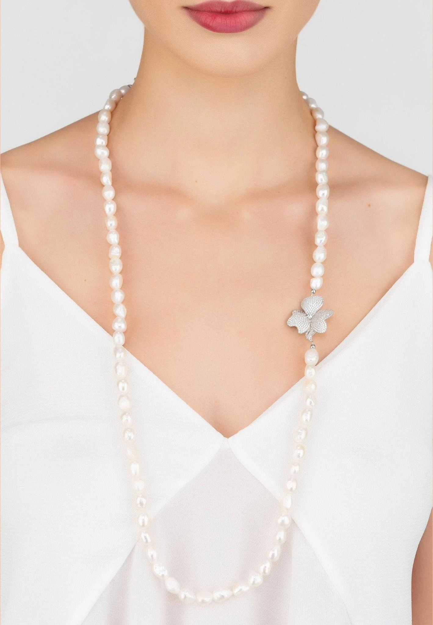 This long pearl gemstone necklace is ideal for those who adore statement jewellery. Make this stunning pearl necklace, adorned by a single zirconia encrusted flower, your new wardrobe staple.