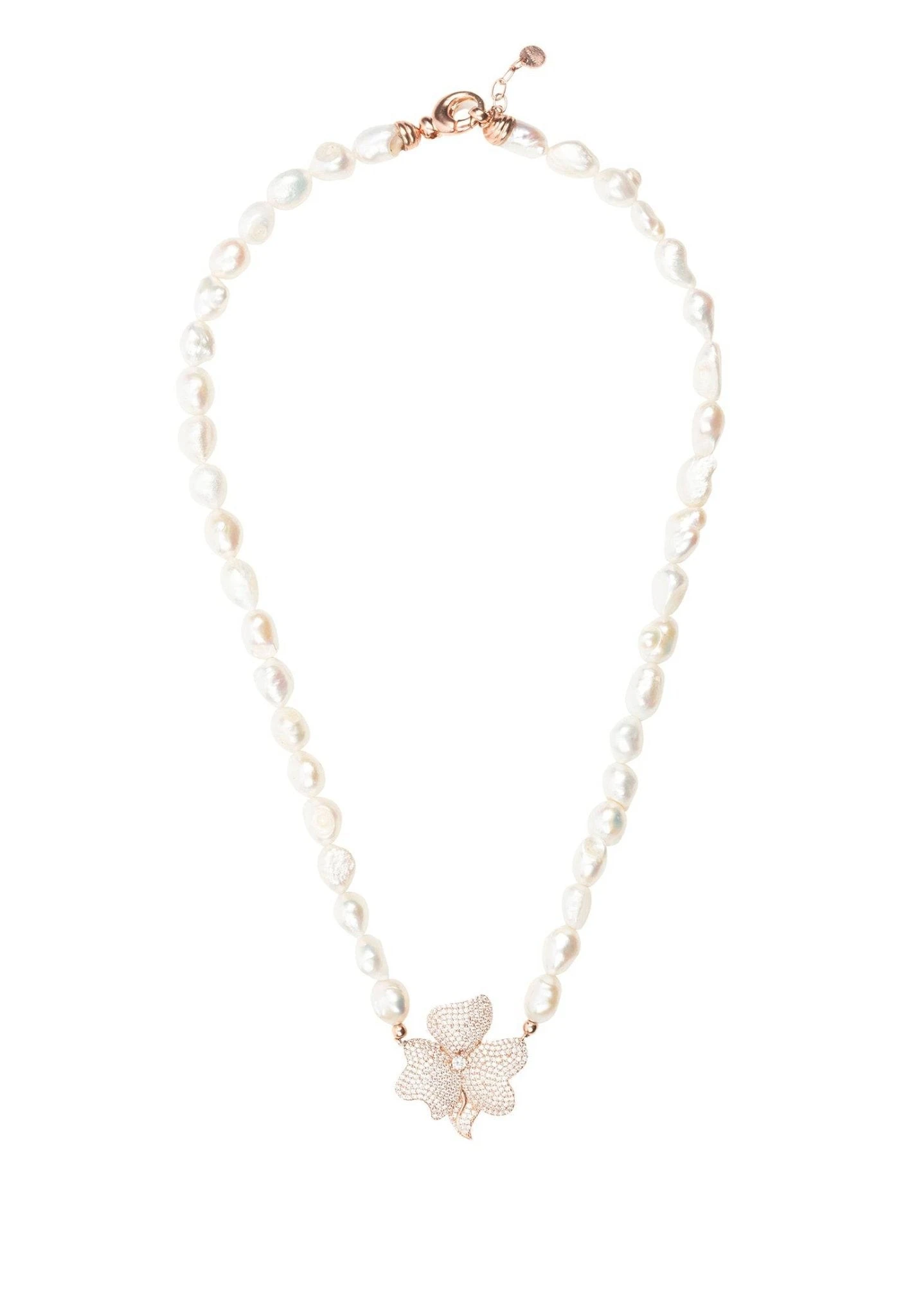 This mid length pearl gemstone necklace is ideal for those who adore statement jewellery. Make this stunning pearl necklace, adorned by a single zirconia encrusted flower, your new wardrobe staple.