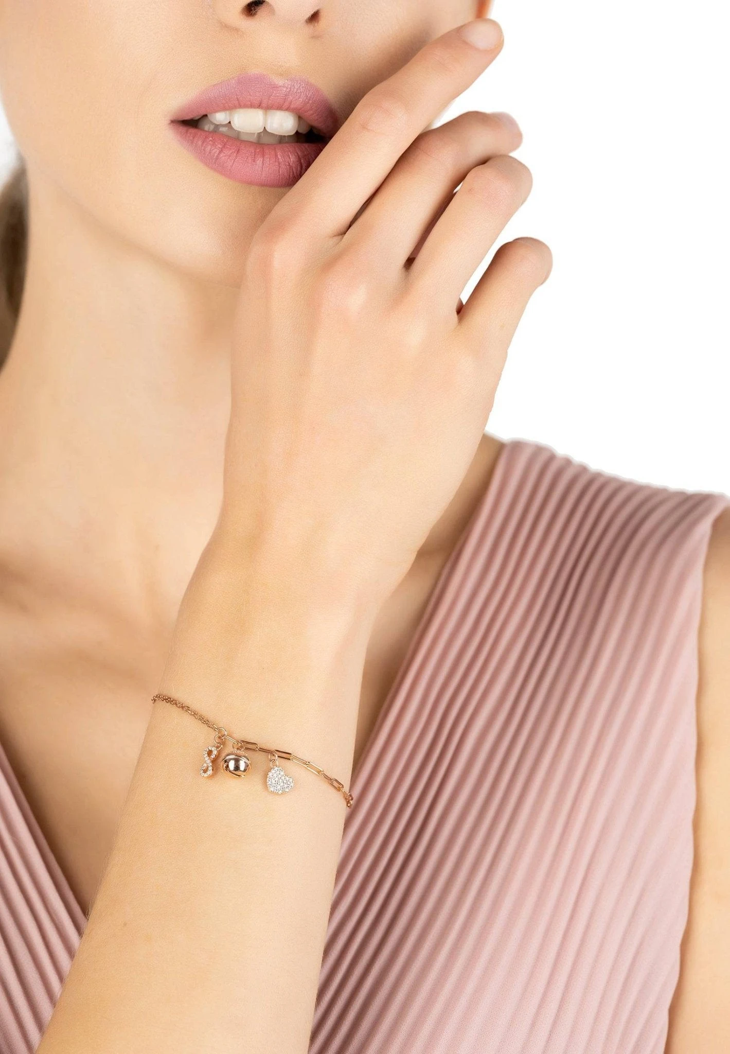 The here to eternity bracelet features three small charms set on a chain, each adorned with micro white zircons. What sets this bracelet apart from others is the unusual design which uses two different styles of chain. One half uses a paper clip chain, whilst the other half is a double fine trace chain.