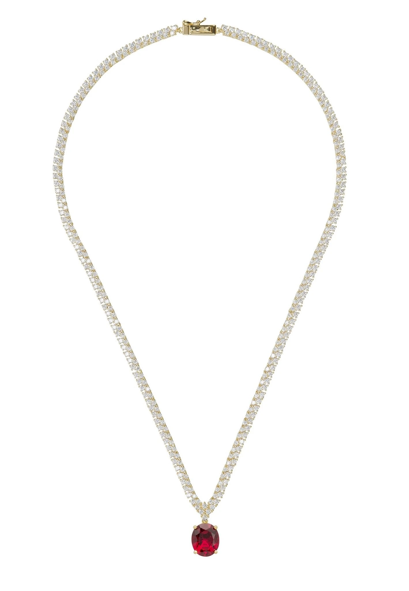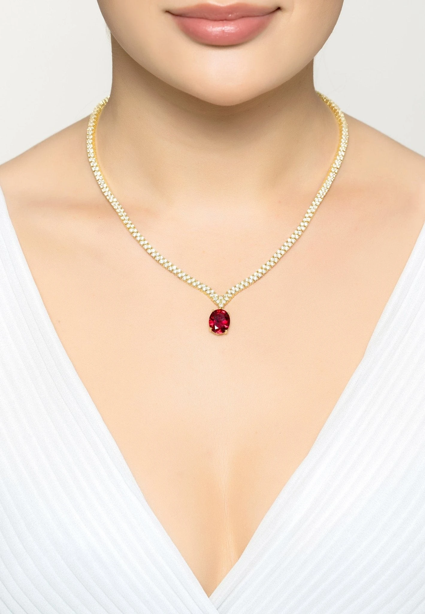 Make a statement with the Garbo Oval Gemstone Tennis Necklace Gold! Bring your look to life with this truly spectacular choker necklace. It adds luxurious designer style to any outfit and can dress up even the simplest of garments. Crafted from beautiful 925 sterling silver that has been dipped in 22ct gold, it’s adorned along its entire length with sparkling zirconia stones, culminating in an eye-catching oval lab-created Ruby gemstone that sits at the base of your neck. Gemstone measures 1.1 cm long by 0.9 cm wide.Â