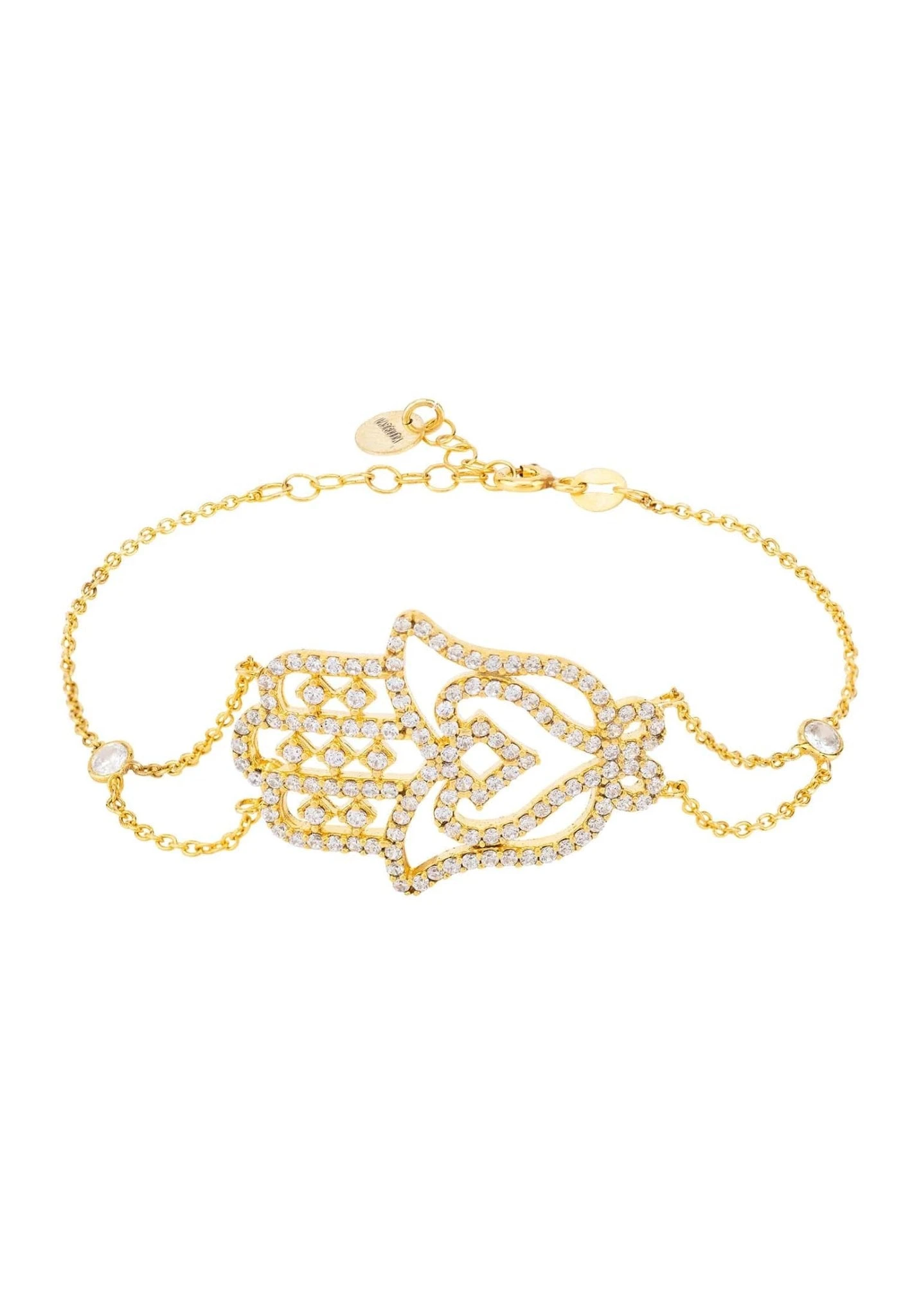 A modern take on an ancient amulet, the Hamsa large hand of Fatima bracelet is great for everyday styling. The large hamsa hand, with open filigree workmanship adorned with cubic zirconia, is set on a double chain bracelet and framed either side with a larger single zircon where it tapers to a single chain.