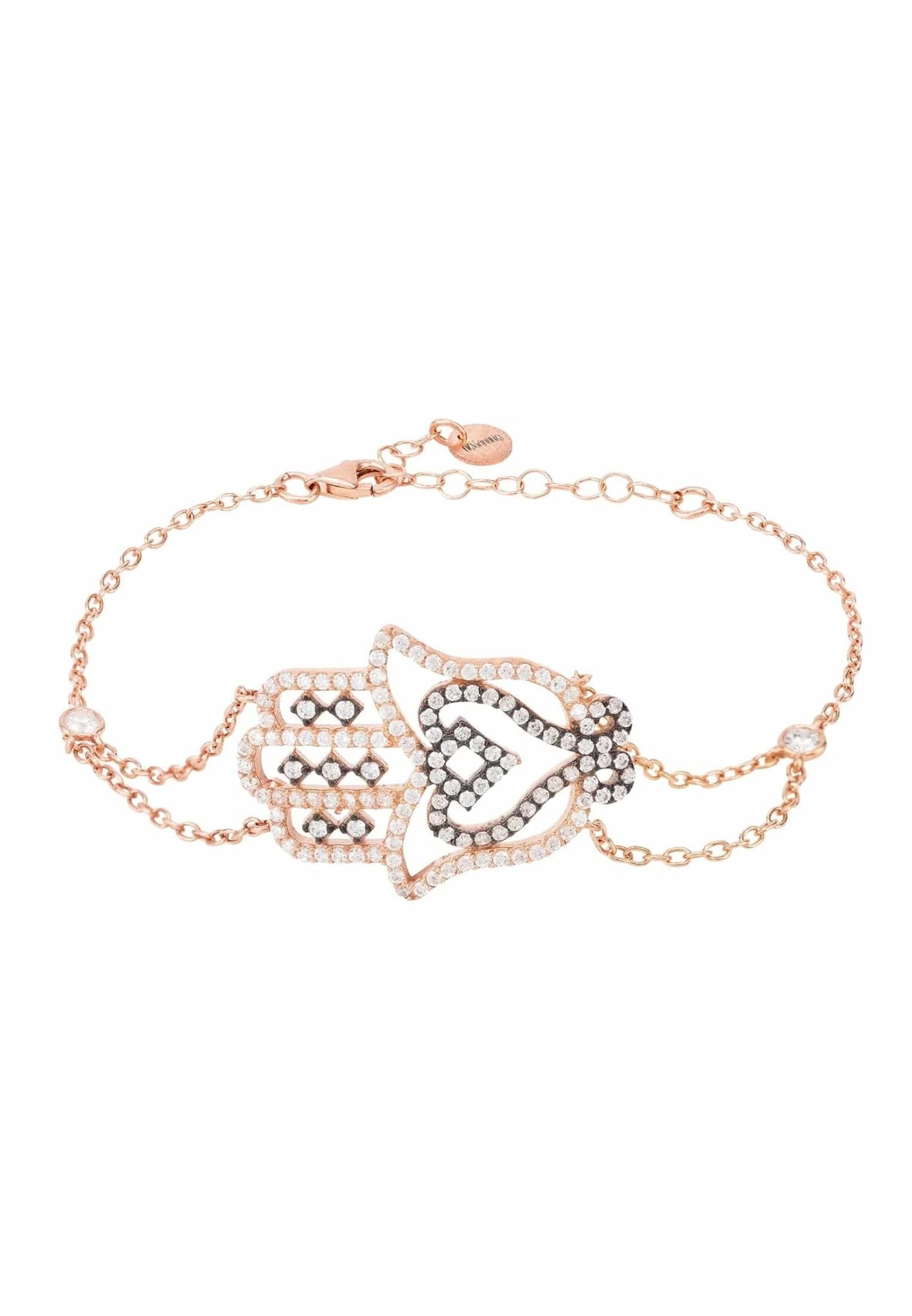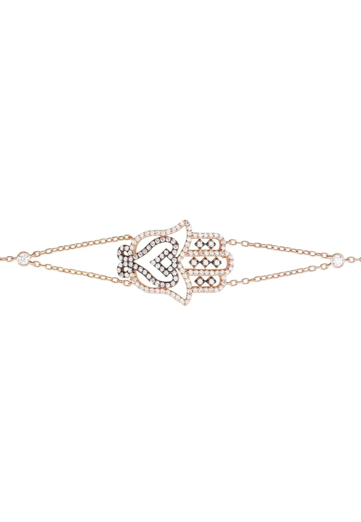 A modern take on an ancient amulet, the Hamsa large hand of Fatima bracelet is great for everyday styling. The large hamsa hand, with open filigree workmanship adorned with cubic zirconia, is set on a double chain bracelet and framed either side with a larger single zircon where it tapers to a single chain.