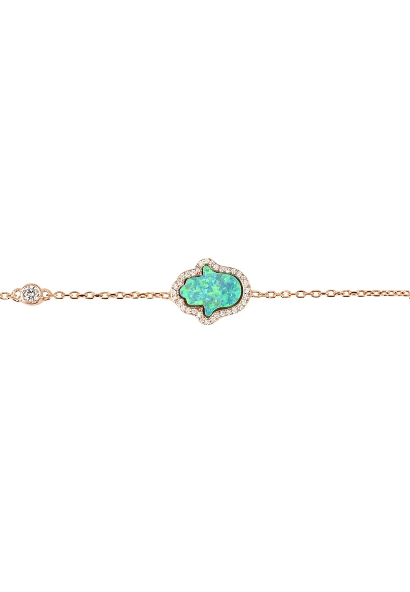 An iridescent opalite Hamza gemstone adds a pop of colour, and is accentuated by a row of sparkling zircons, which catch the light dazzling from day to night.