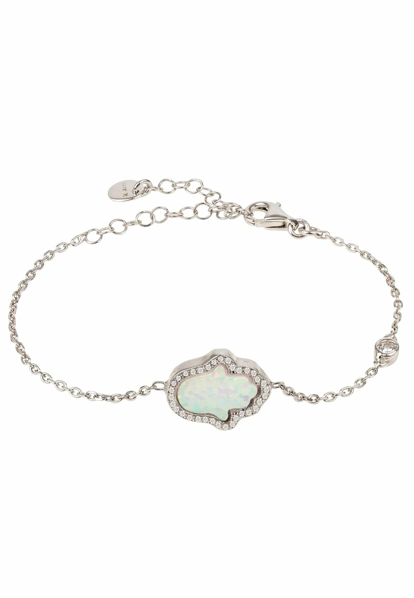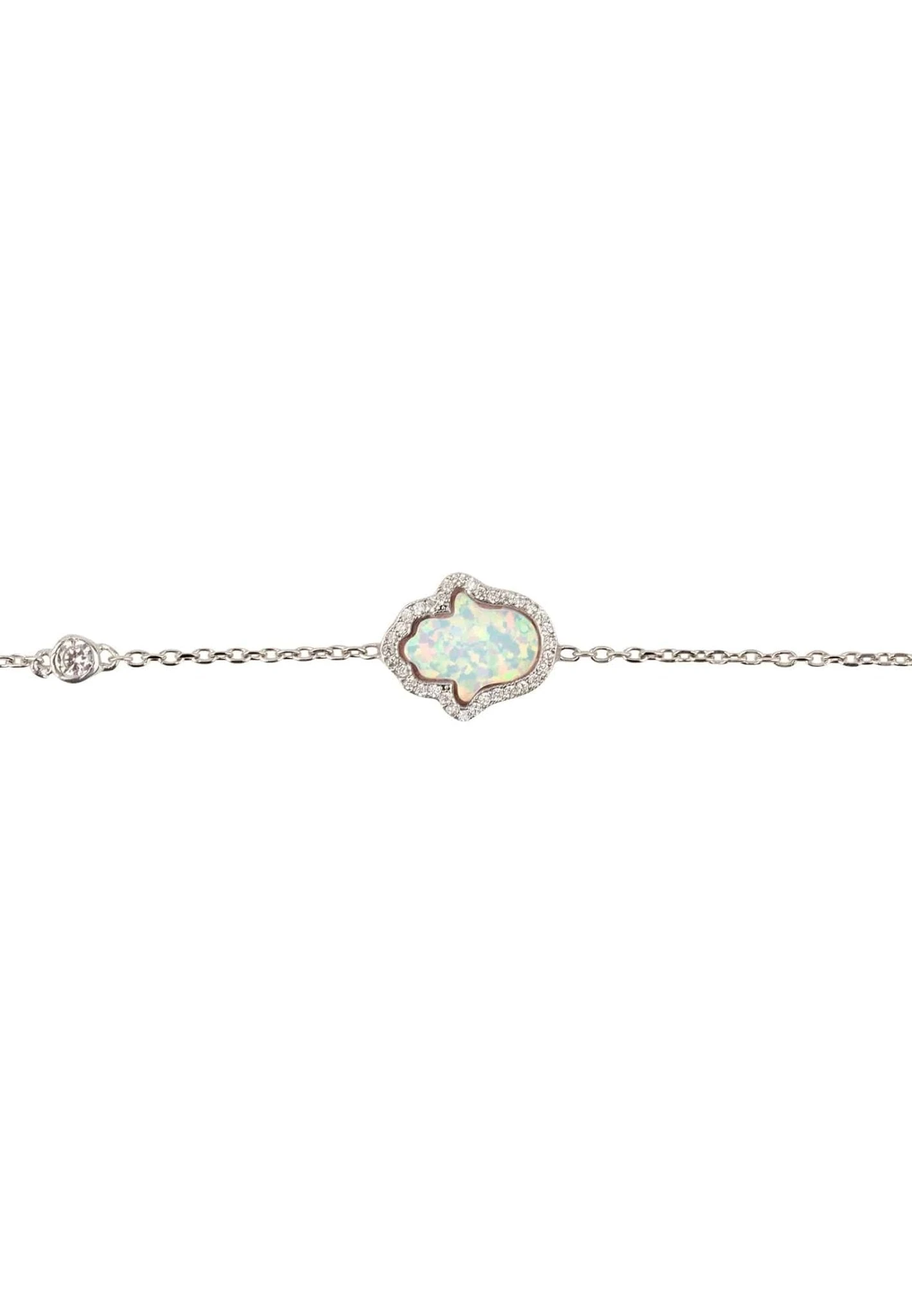 An iridescent opalite Hamza gemstone adds a pop of colour, and is accentuated by a row of sparkling zircons, which catch the light dazzling from day to night.