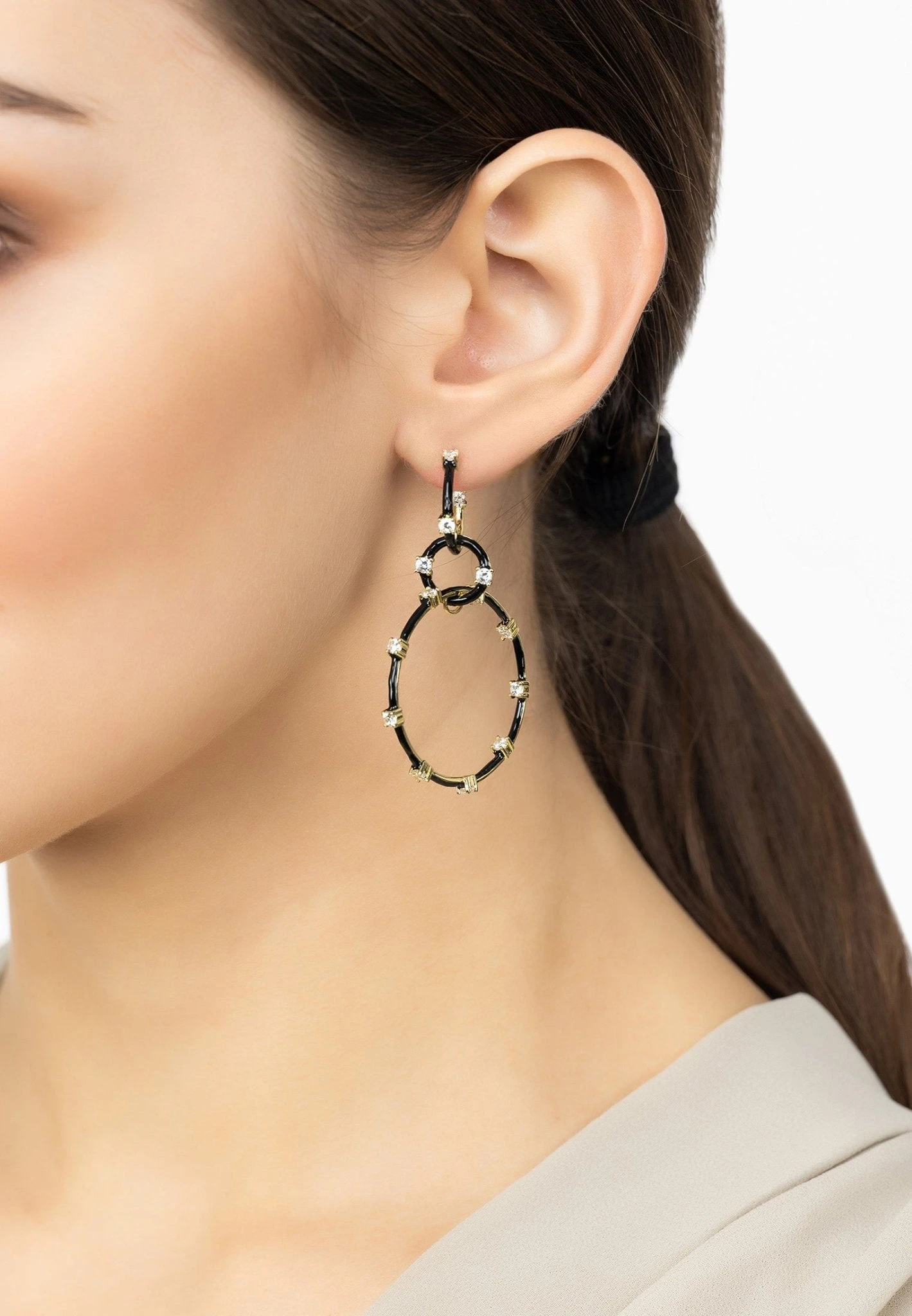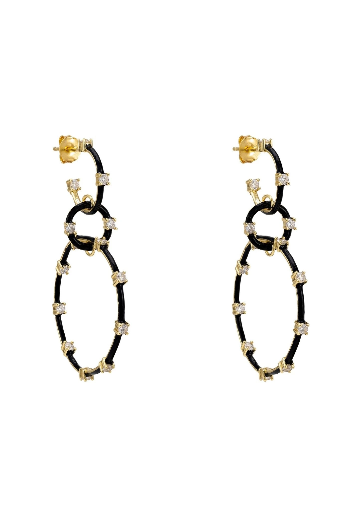 They are made from 925 sterling silver and dipped in gold for a luxurious feel, then decorated with black enamel and evenly spaced single cubic zirconia, adding just the right amount of sparkle. The two different sized circles are interlinked and attached to a small hoop top with a post and butterfly fastening. This allows for movement in these highly fashionable drop earrings. They are 5.7cm long, 3.3 cm wide and weigh 8.4 grams, so they are sure to make a statement but are very comfortable to wear while doing it.