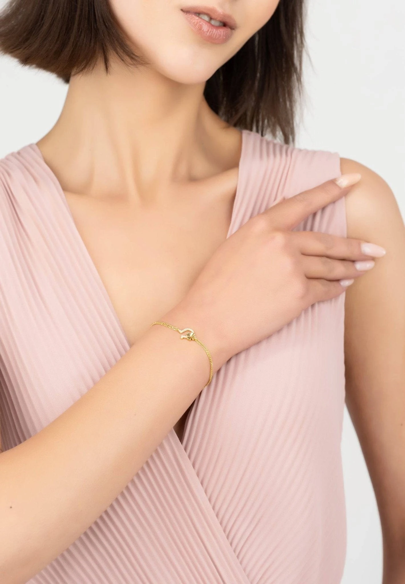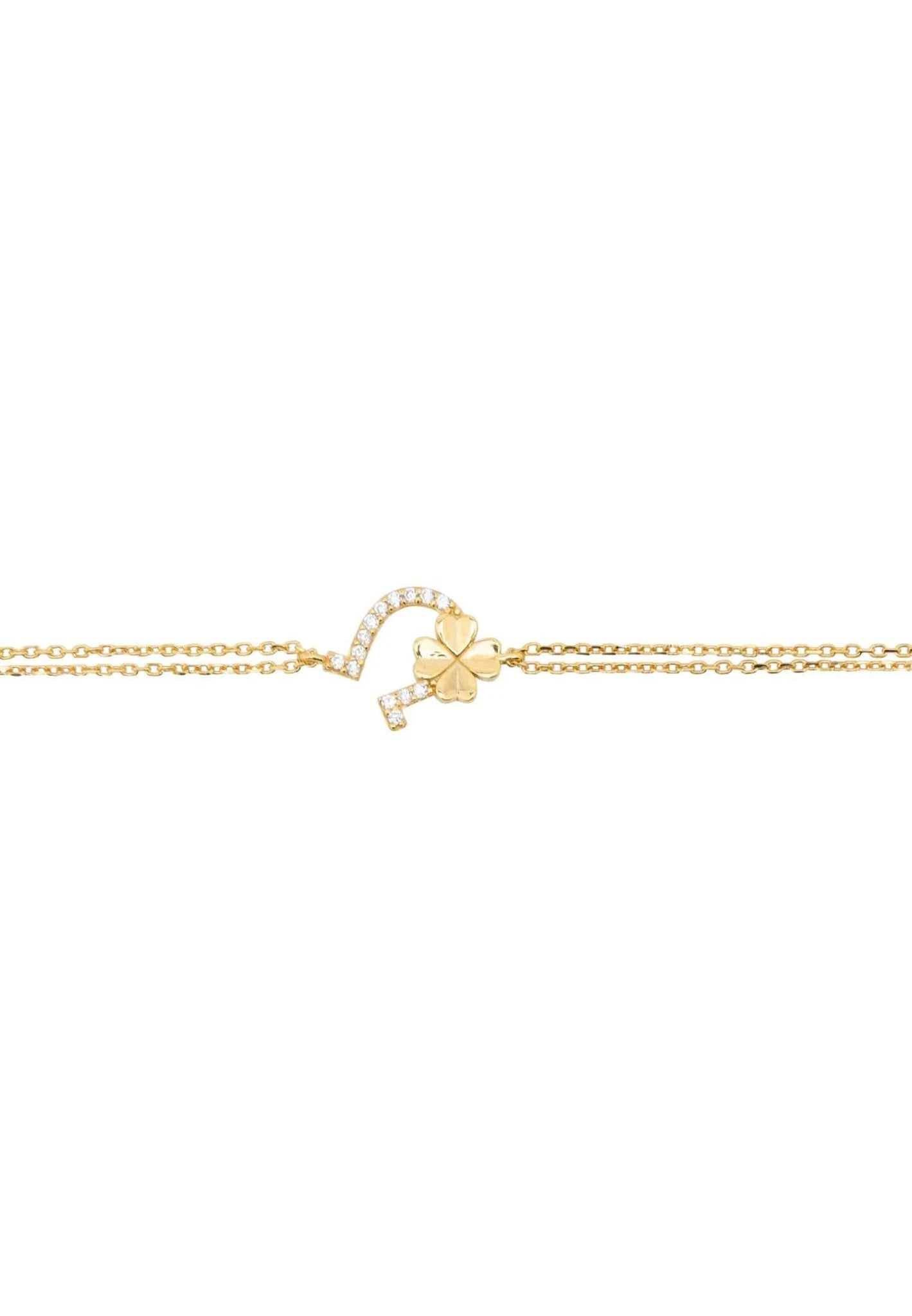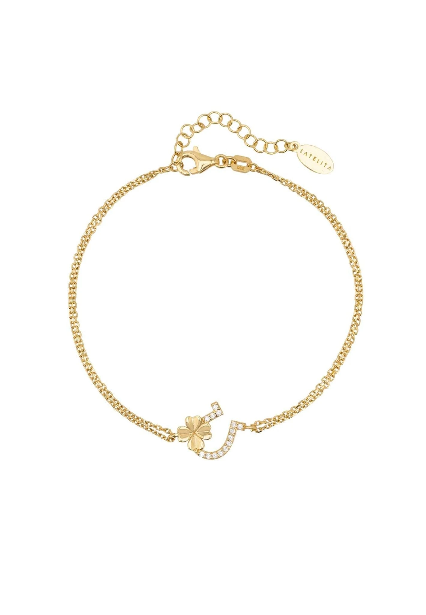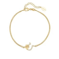 This simple yet chic, Horseshoe and Shamrock bracelet is perfect for everyday styling. Handcrafted in sterling silver, this bracelet features a double chain with the horseshoe & shamrock motif suspended at its centre. The horseshoe is adorned with zircons whilst the shamrock has been left in a highly polished metallic for added interest.