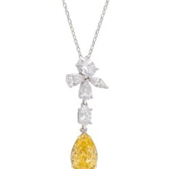 The pendant is in the design of an intricate four-petal flower design, which is set with sparkling simulated diamonds, supporting a dangling pear-shaped citrine, which is a truly beautiful centrepiece.