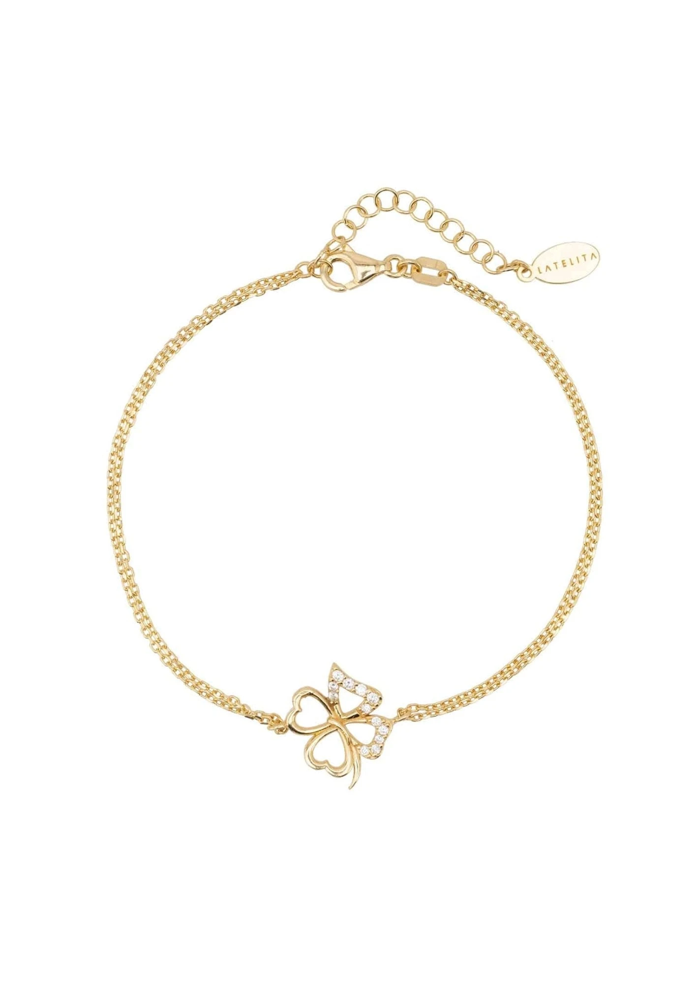 This beautifully chic, lucky Shamrock clover bracelet is perfect for everyday styling. Either worn singularly or layered for a more dramatic look. Handcrafted in sterling silver, each bracelet features a double chain supporting an open shamrock clover at its centre. Two of the four heart shaped leaves are adorned with sparkling zircons, whilst the other two remain plain.