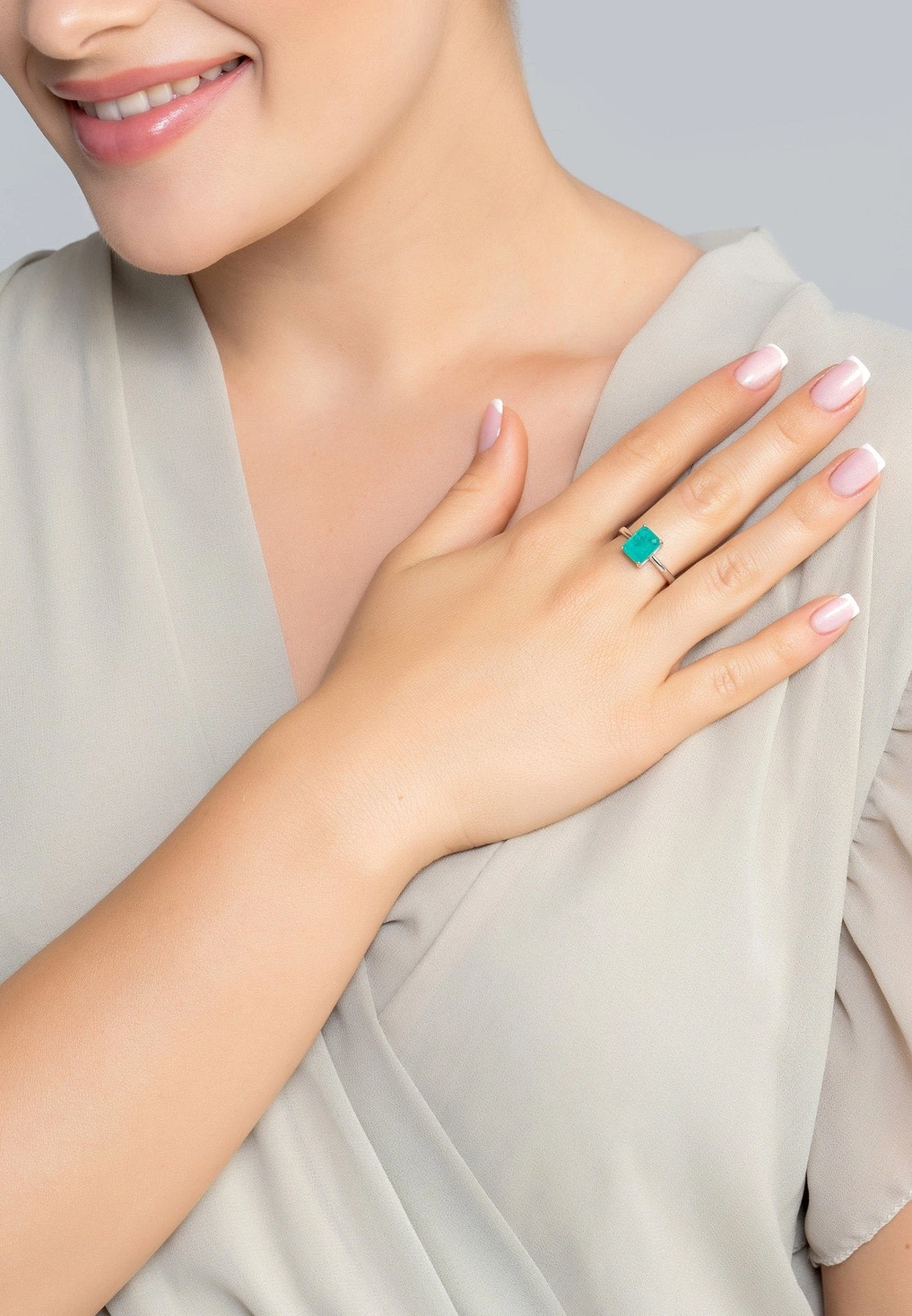 Are you looking for something that will make heads turn? Say hello to the Middleton Rectangle Paraiba Tourmaline Cocktail Ring Silver, handcrafted and designed with elegance and finesse. An eye-catching lab-grown tourmaline sits atop a plain single band in an open rectangular shape setting (0.9cm x 0.7cm)- making it a truly unique piece of jewellery! Looking like it’s been pulled out of a fairy tale, this delicate ring will bring out your inner princess – whatever the occasion.Â