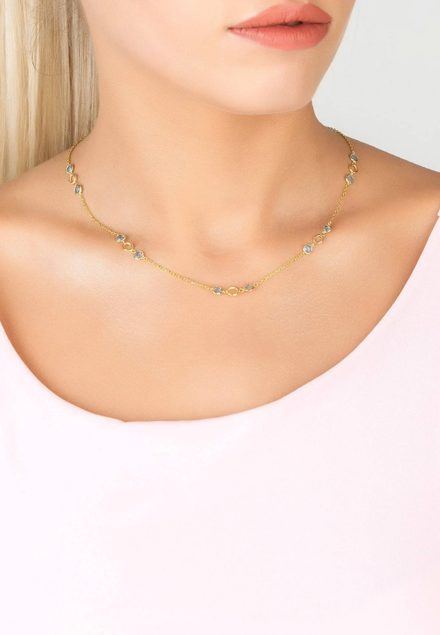 Let this Milan link gemstone necklace be your new wardrobe staple. Ideal for those who love delicate jewellery, this gemstone necklace features ten round cut gemstones spaced evenly on a fine chain in groups of three which incorporates a central hollow link.