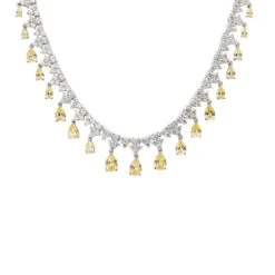 Transform your look with the Monroe Gemstone Statement Necklace in Lemon Topaz and Silver. This head-turner of a necklace is made from 925 silver and measures 46 cm long and is decked out in sparkling cubic zirconia from end to end. But what steals the show are the twenty-one lab-created lemon topaz teardrops. Arranged in graduated sizes with the largest at the centre, which gives the necklace a 2.0 cm depth. The whole piece weighs a substantial 41.4 grams, so you know it’s got that high-quality feel.