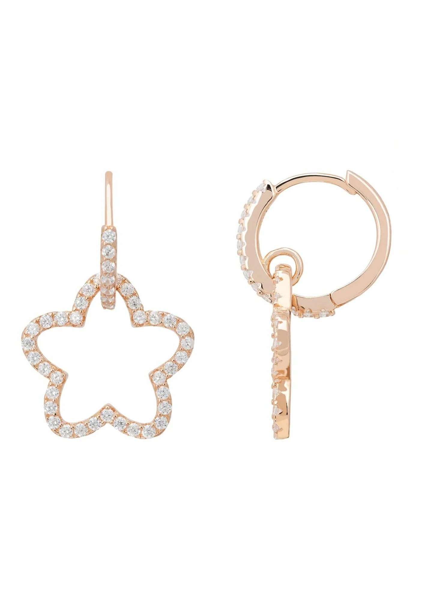 These floral inspired hoop earringsĀ haveĀ anĀ open flower motif adorned with sparkling white zircons, interlinked withĀ a huggie hoop, which is decoratedĀ onĀ the front edge with even more zircons. These pretty hoopsĀ are hinged for ease of application and hug the earlobe for an elegant, understated aesthetic making them perfect for those who covet delicate jewellery with added sparkle.