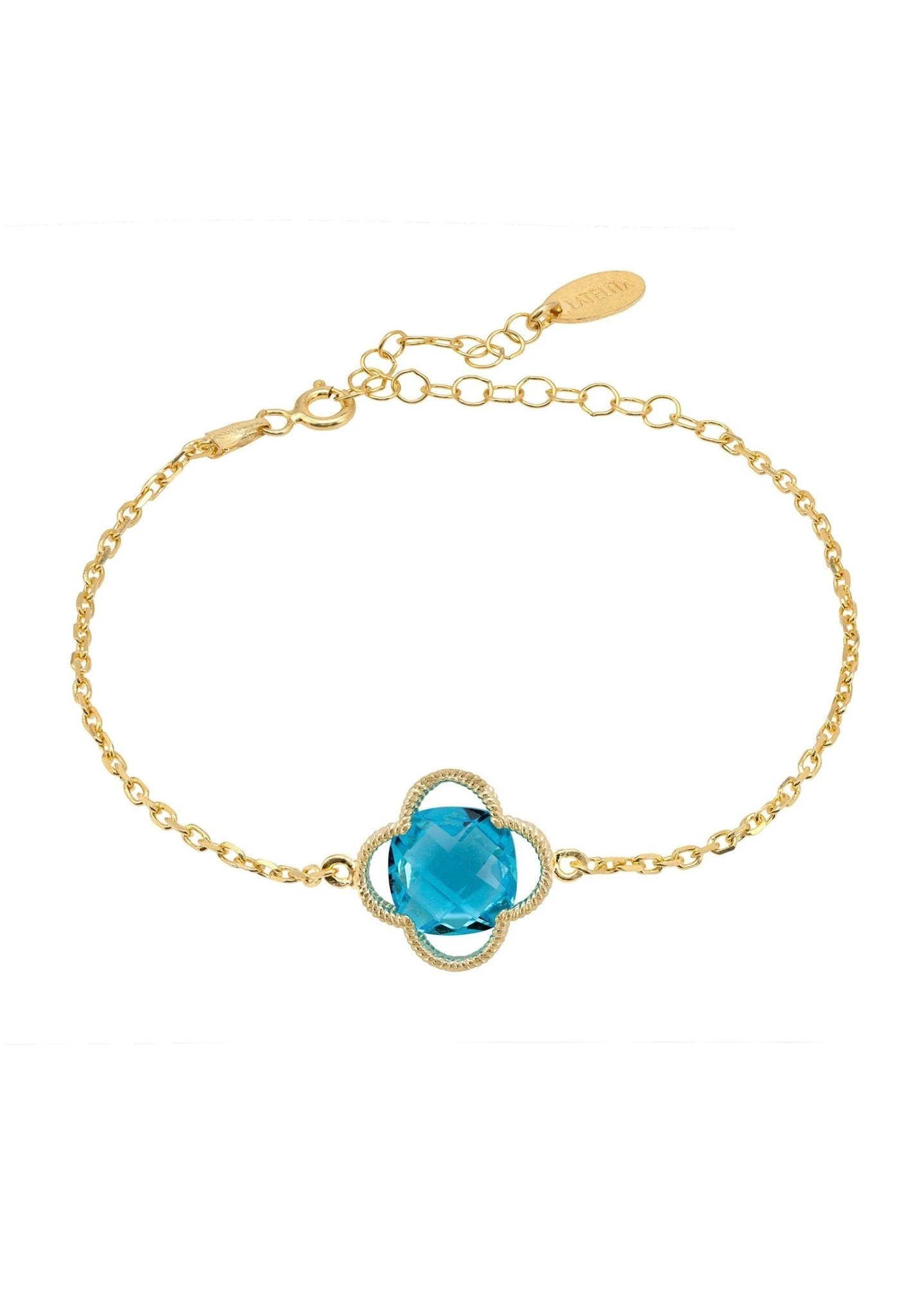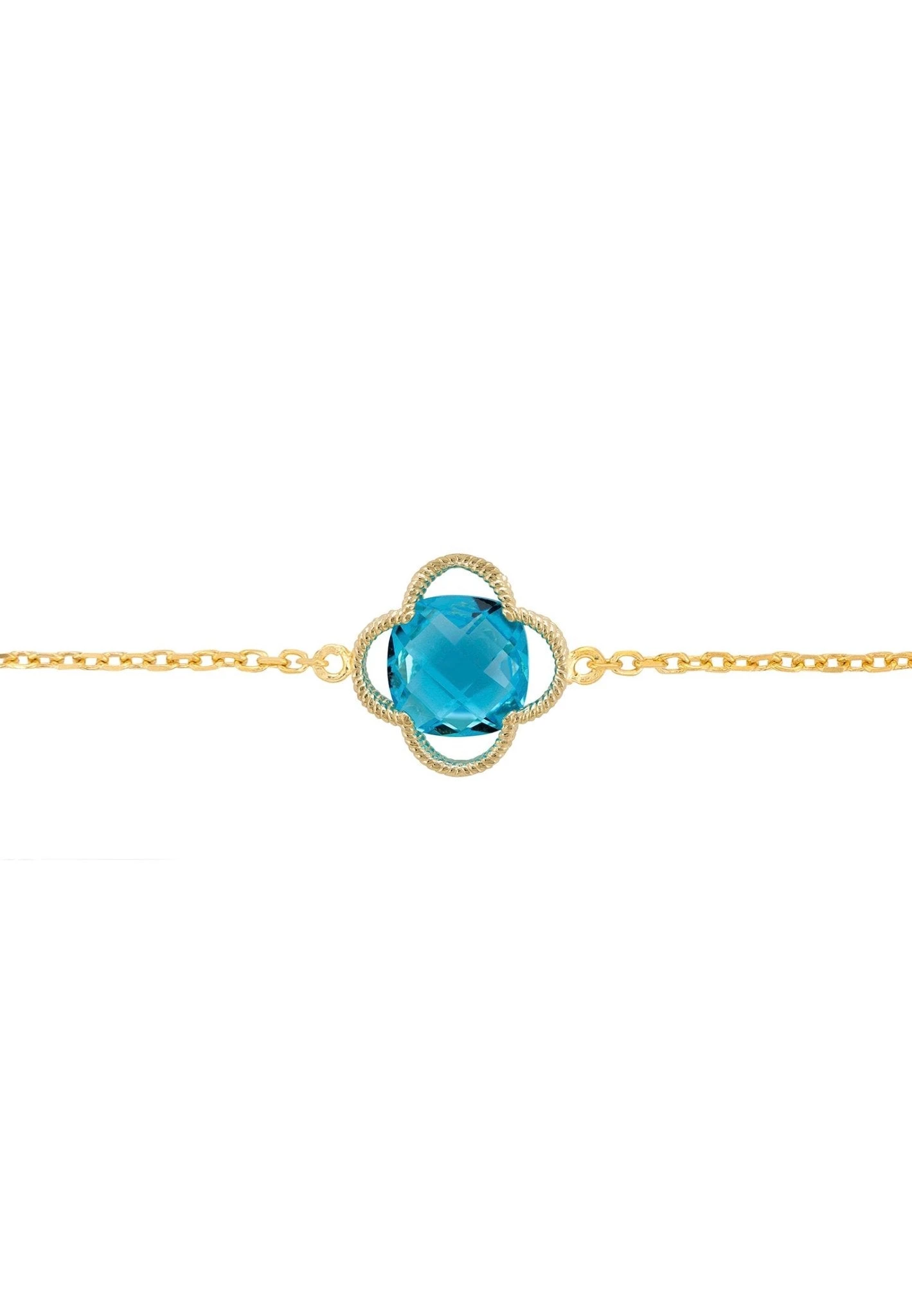Add a touch of elegance to any outfit with our Open Clover Flower Gemstone Bracelet! Made from 925 sterling silver that has been dipped in 22ct gold. The metallic open clover setting has a twisted pattern design, with a pretty blue topaz at its centre.