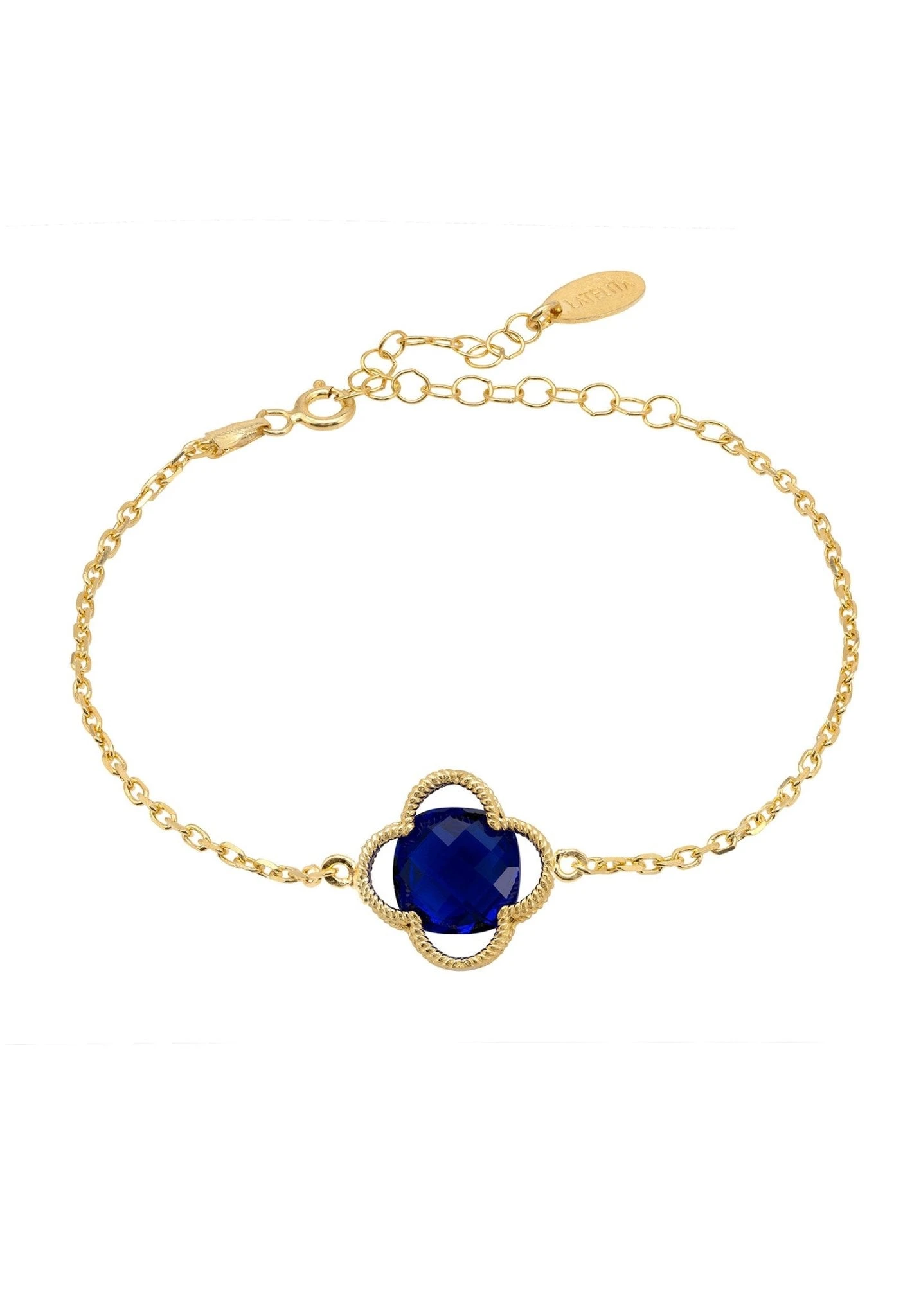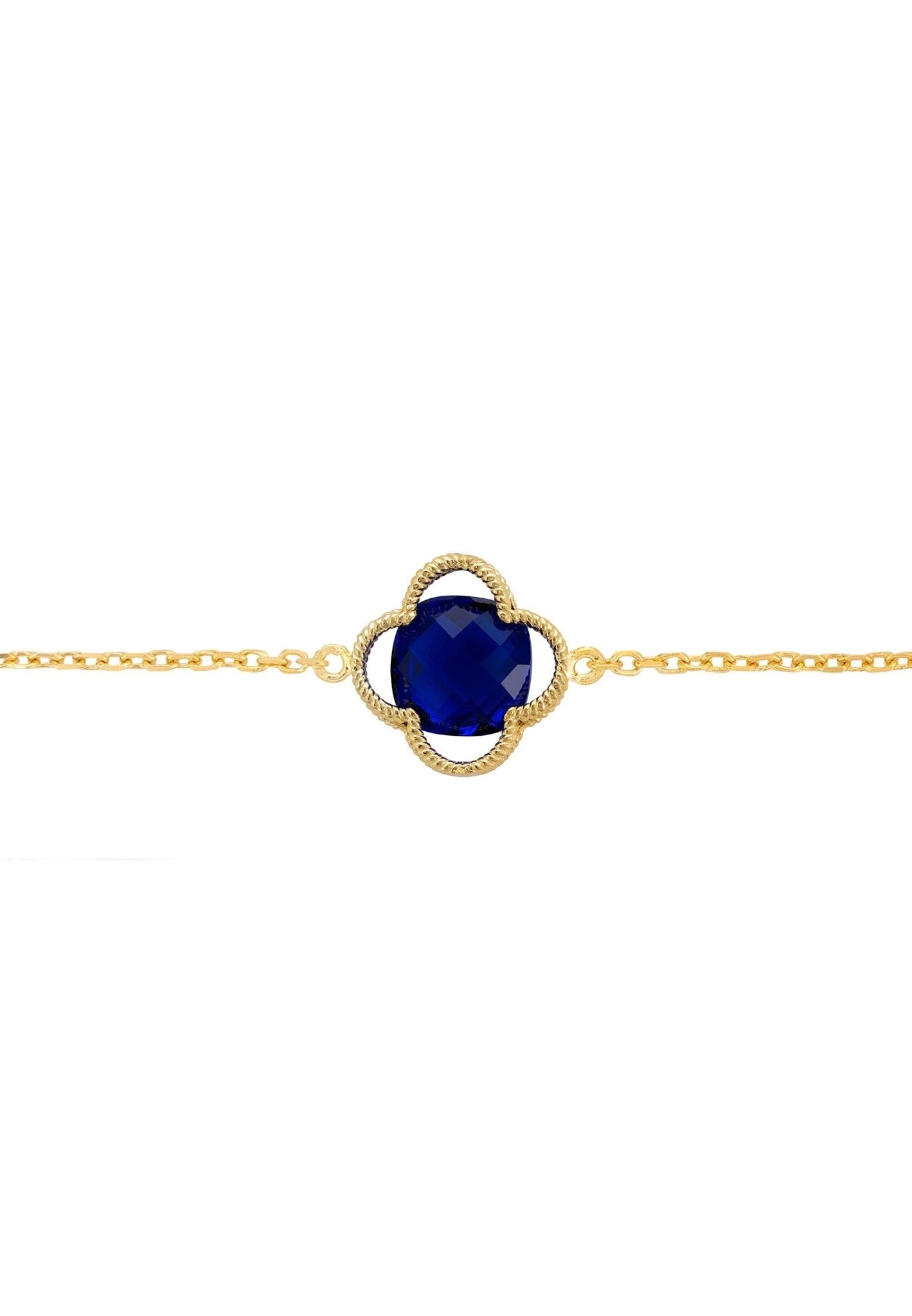 The contemporary twist on a classic style comes from the textured metallic elements, which are elegantly twisted. A pretty sapphire gemstone is placed at the centre of the open clover design, making it the perfect accessory for anyone who loves to add colour and glamour to an outfit. The bracelet is 15cm long with a 5cm length adjuster, making it the perfect size for any wrist. The gemstone and setting measure 1.5×1.5cm and the bracelet weighs 2.5 grams, perfect to wear all day long without feeling weighed down.