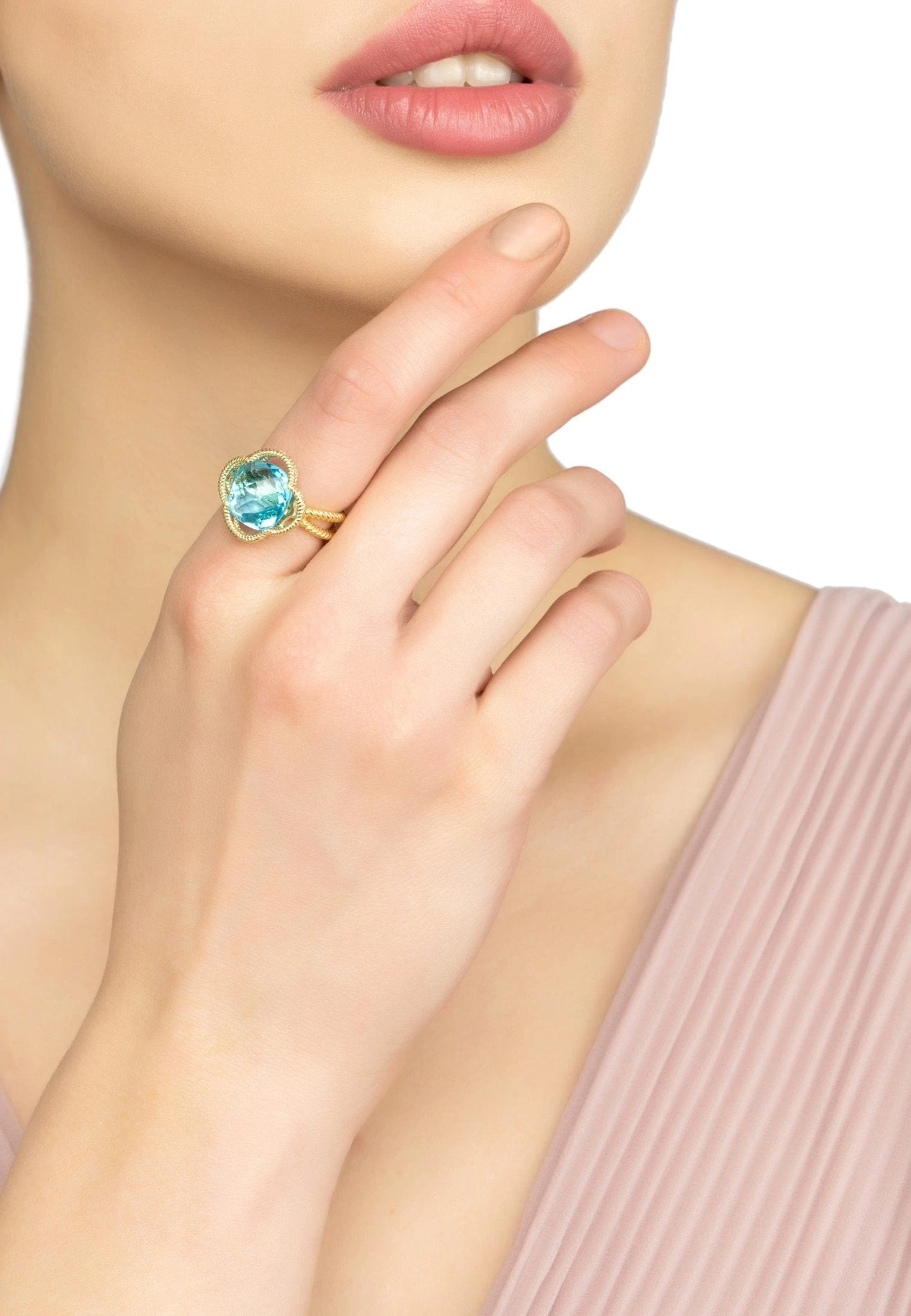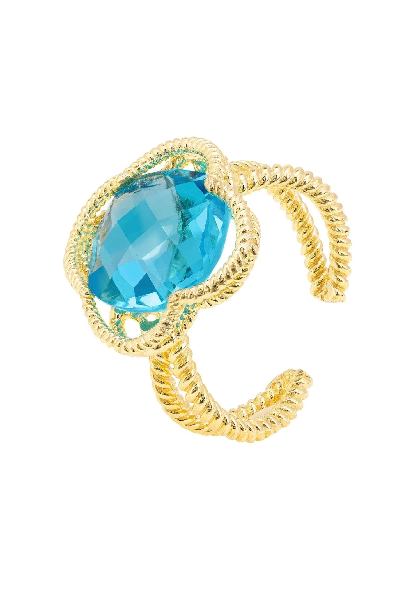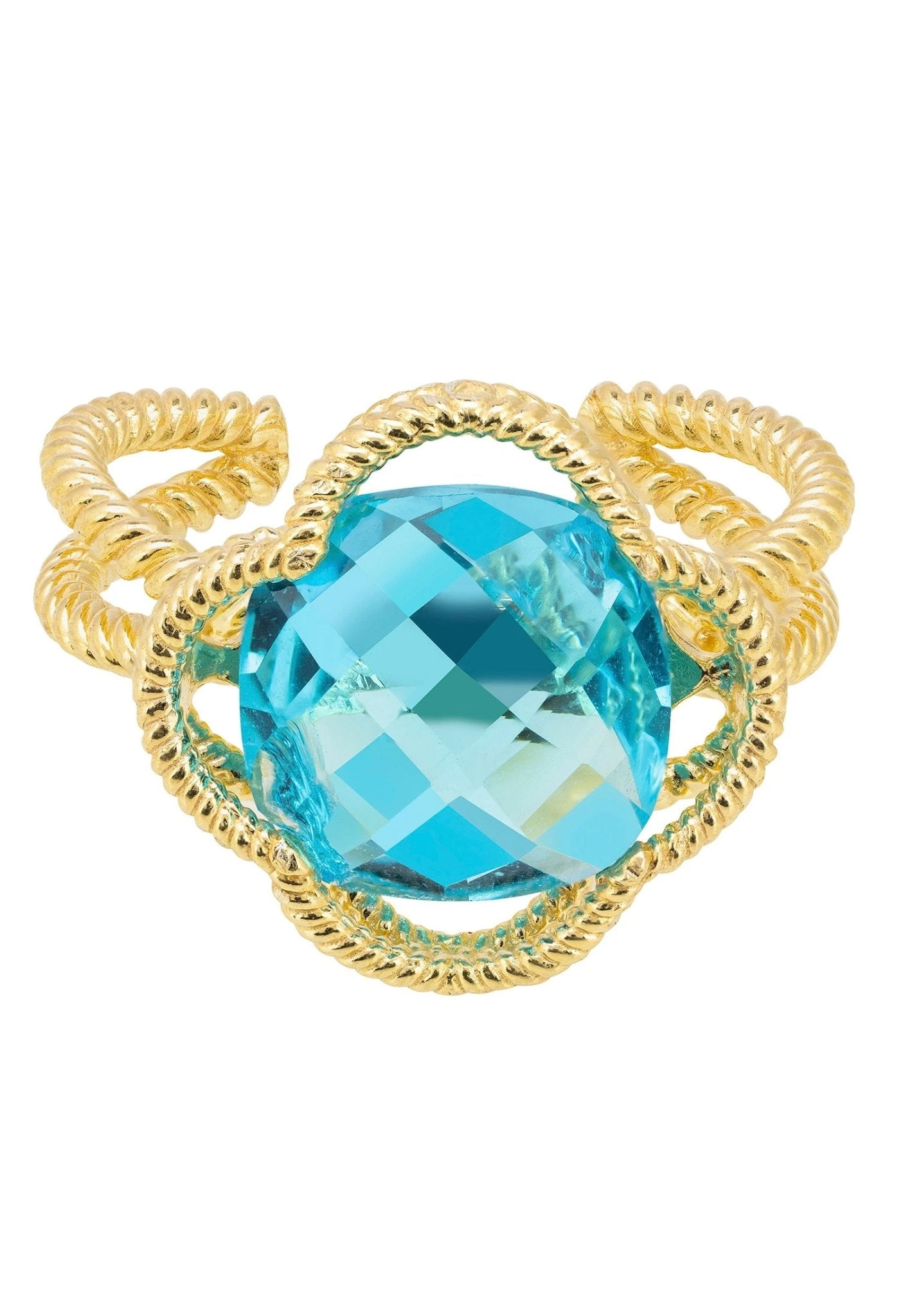 Handcrafted with 925 sterling silver and dipped in 22ct gold. This ring’s contemporary twist on a classic style comes from its textured metallic elements, which are elegantly twisted. A striking blue topaz gemstone is placed at the centre of the open clover design, making it the perfect accessory for anyone who loves to add colour and glamour to an outfit.