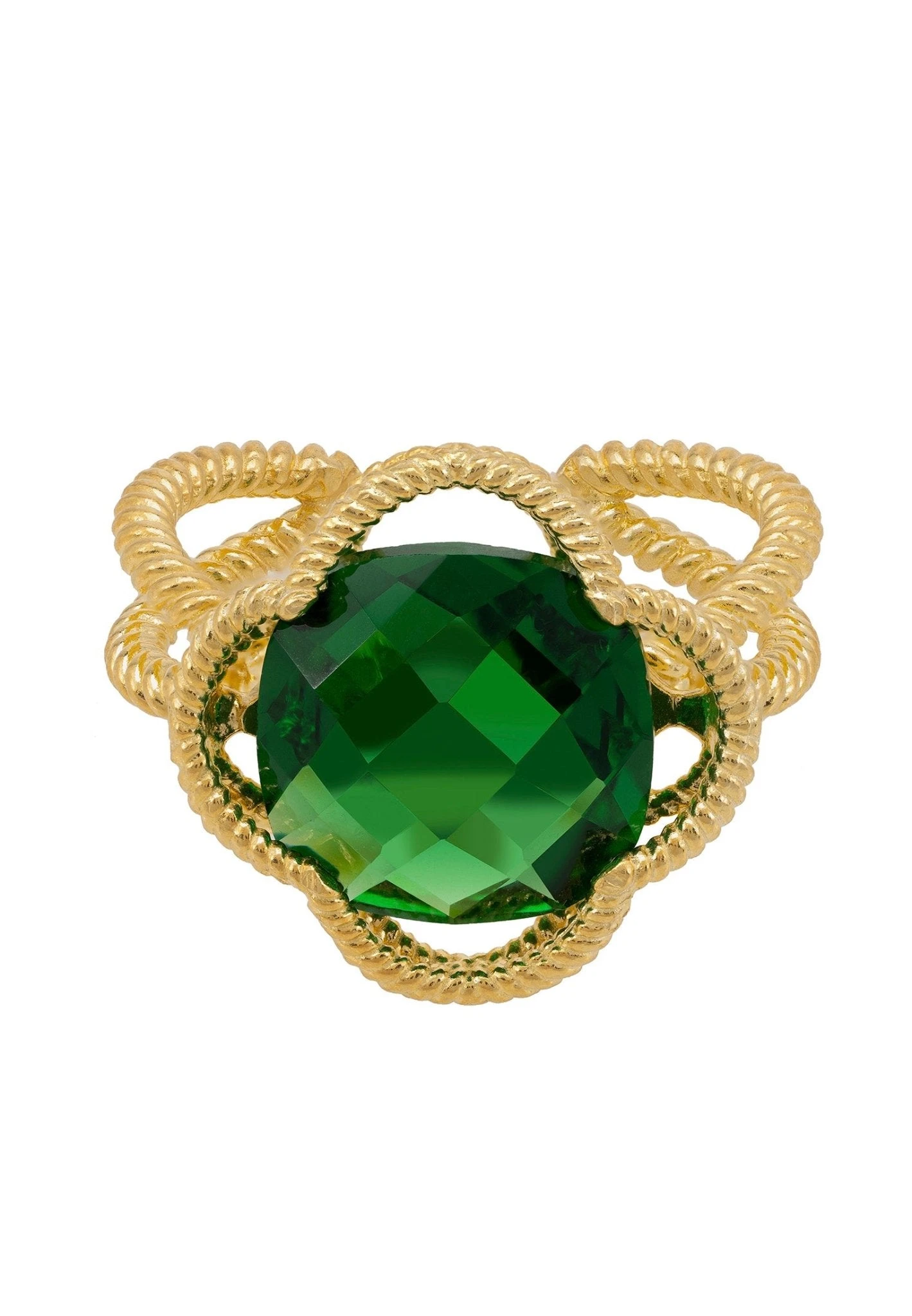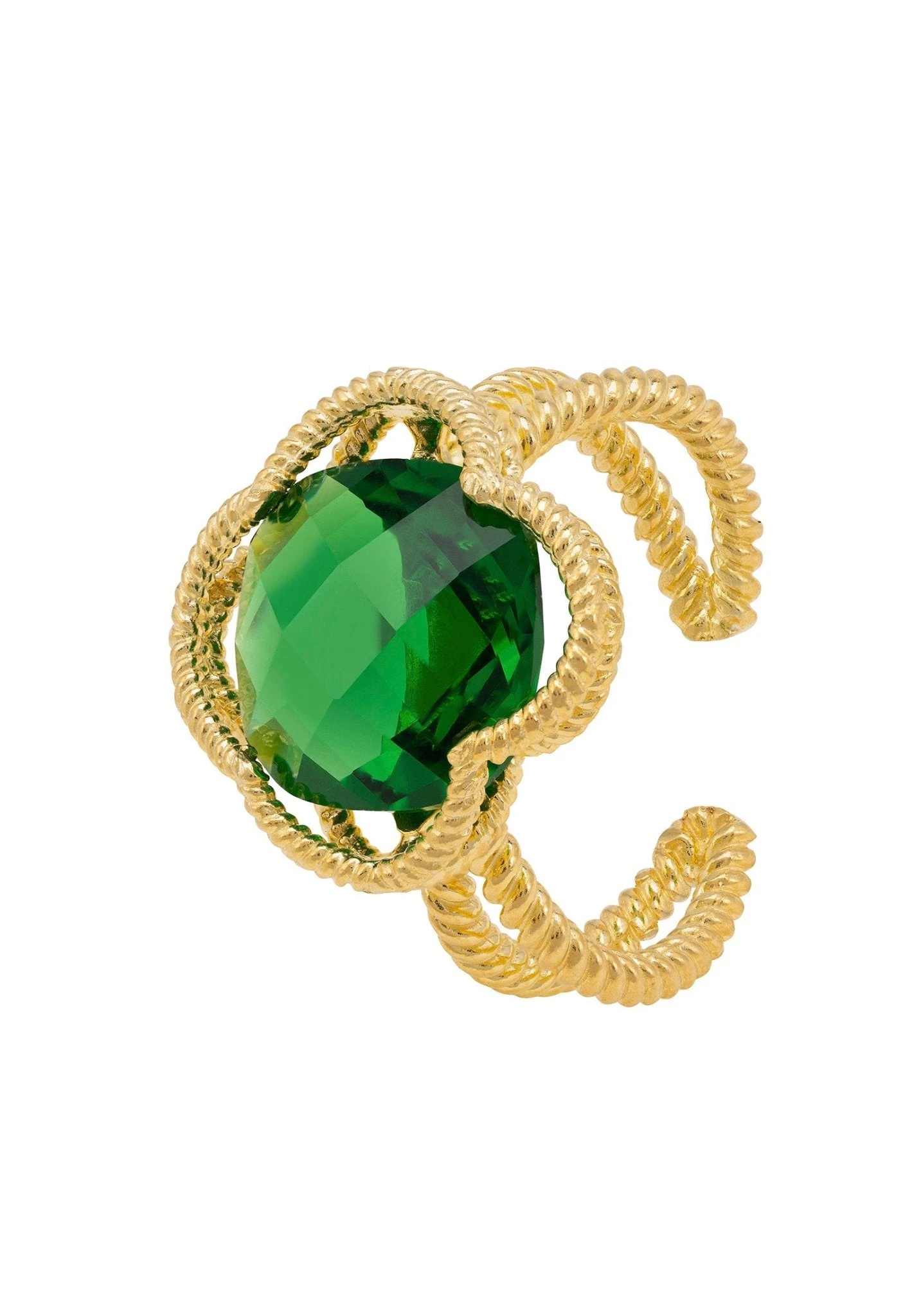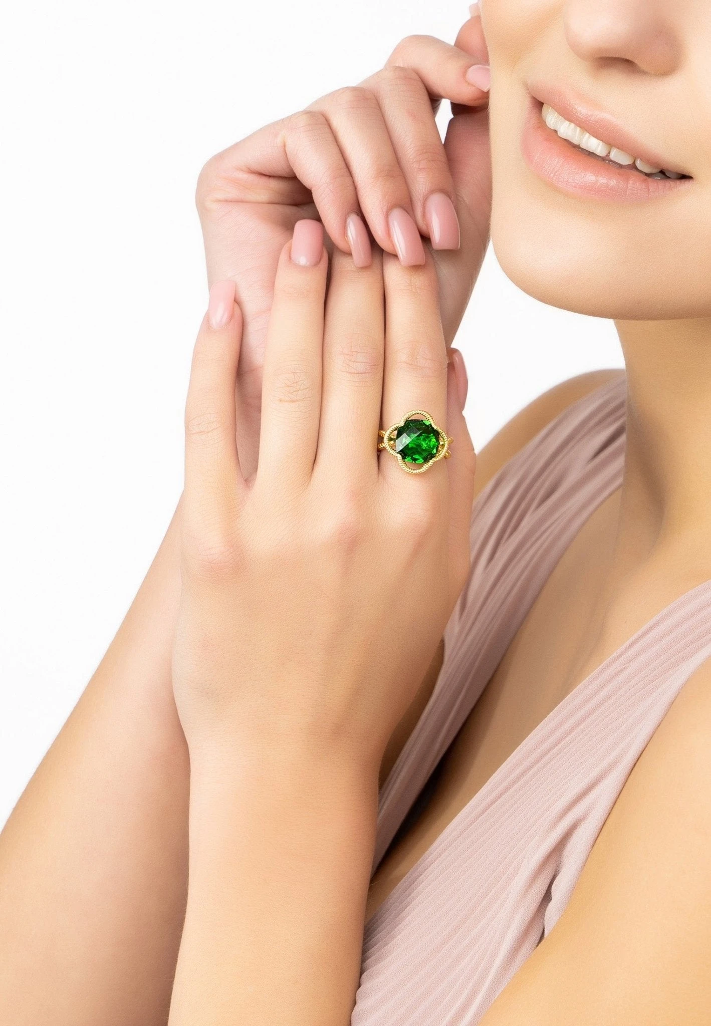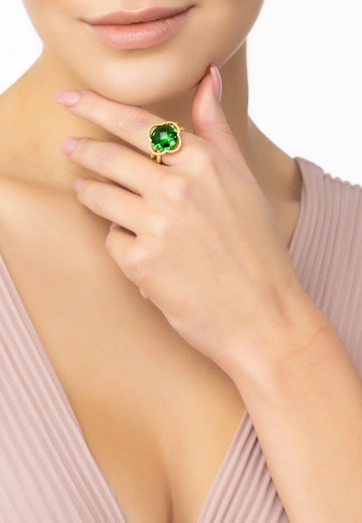 Handcrafted with 925 sterling silver and dipped in 22ct gold. This ring’s contemporary twist on a classic style comes from its textured metallic elements, which are elegantly twisted. A deep green emerald gemstone is placed at the centre of the open clover design, making it the perfect accessory for anyone who loves to add colour and glamour to an outfit.