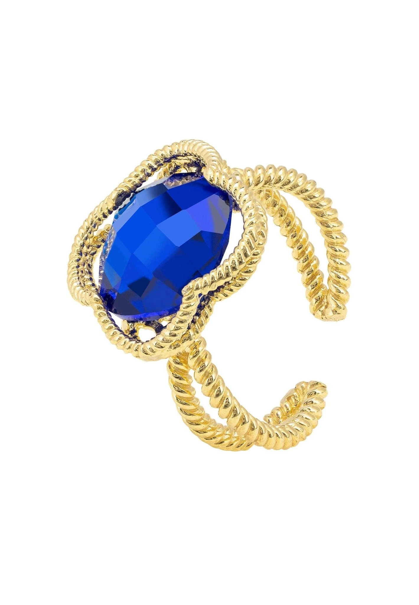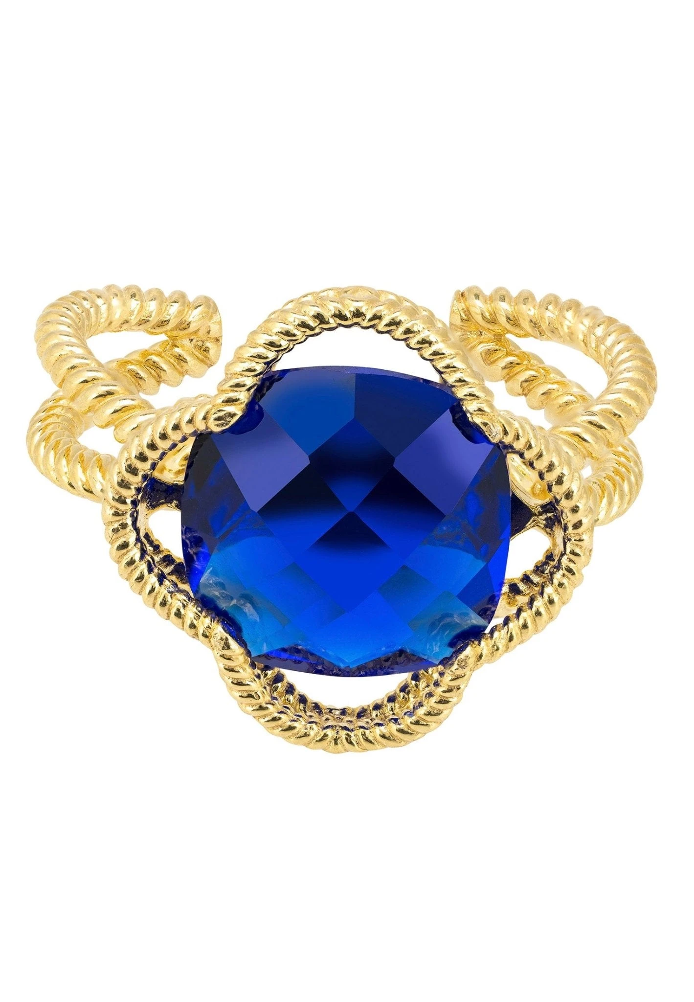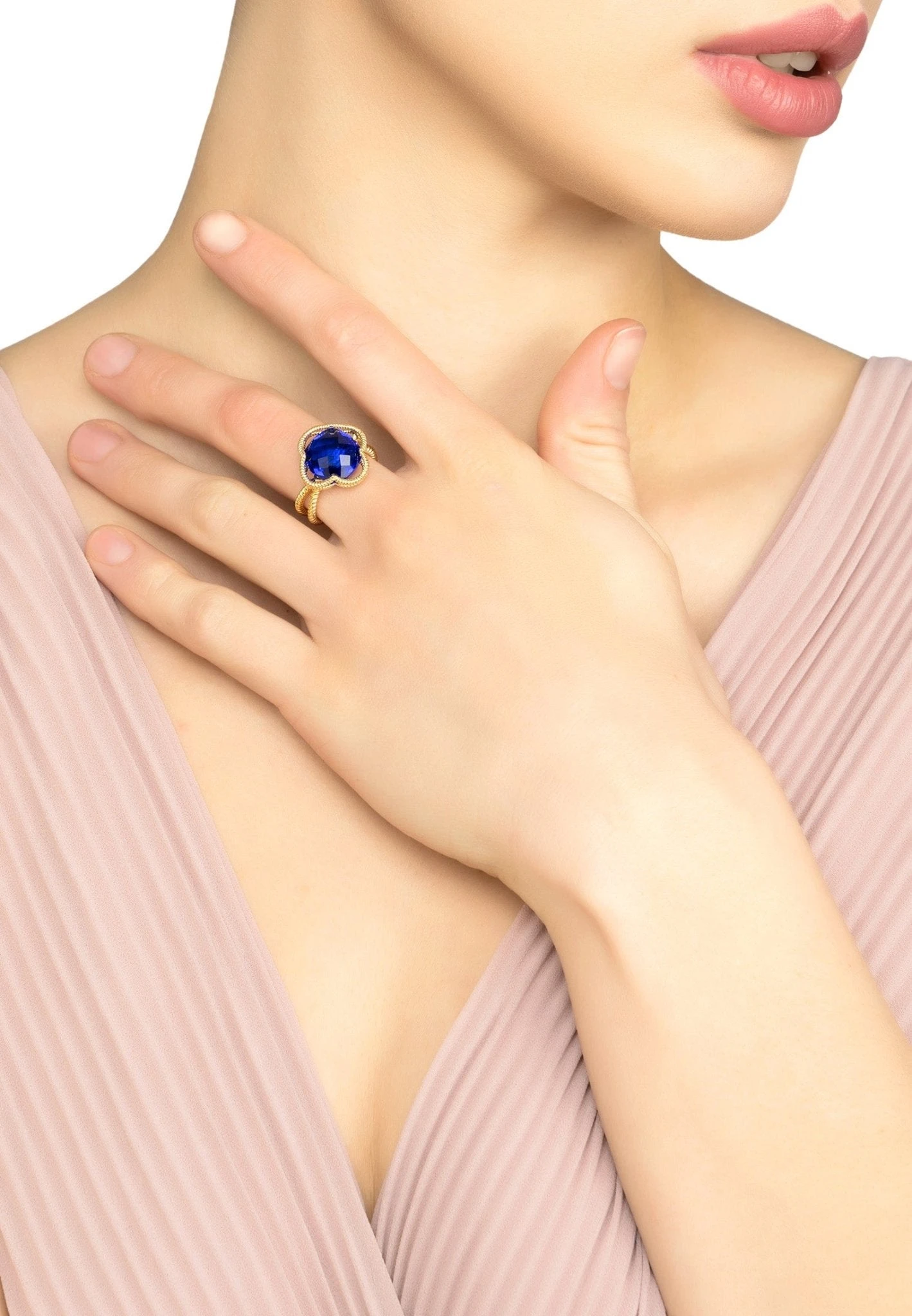 Handcrafted with 925 sterling silver and dipped in 22ct gold. This ring’s modern take on a classic style comes from its textured metallic elements, which are elegantly twisted. The open clover design is centred with a beautiful, deep blue sapphire gemstone. If you love to add some colour and glamour to your outfits, this is the perfect accessory for you!
