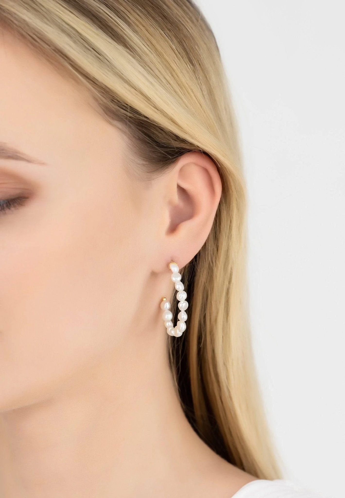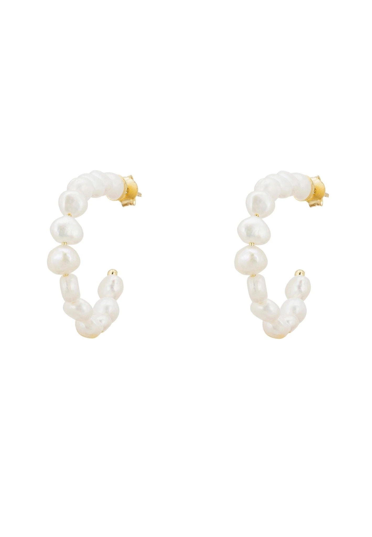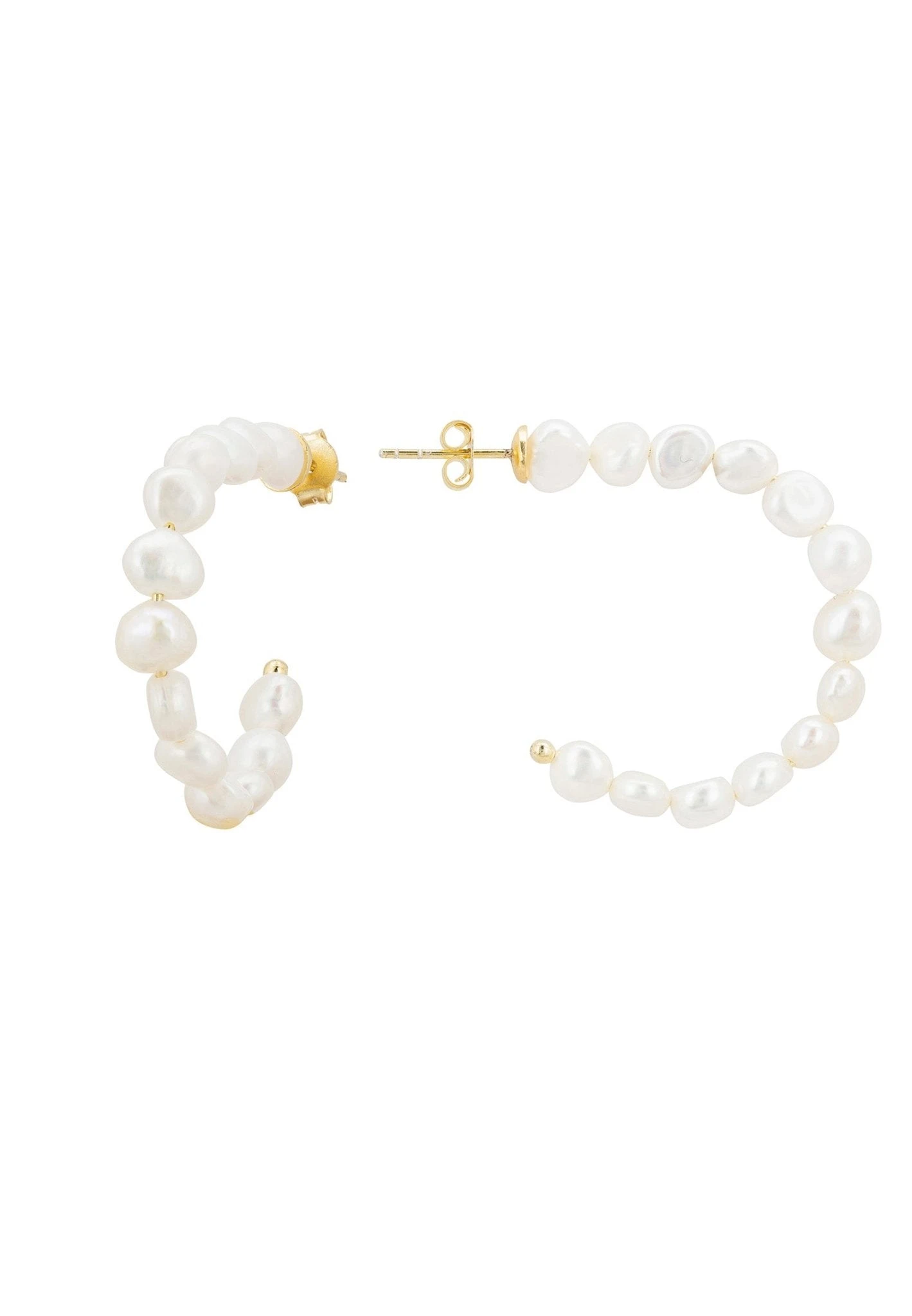 These pretty hoop earrings are stylishly simple but elevated to another level with the addition of white pearls, which adorn the entire length of the hoop.
