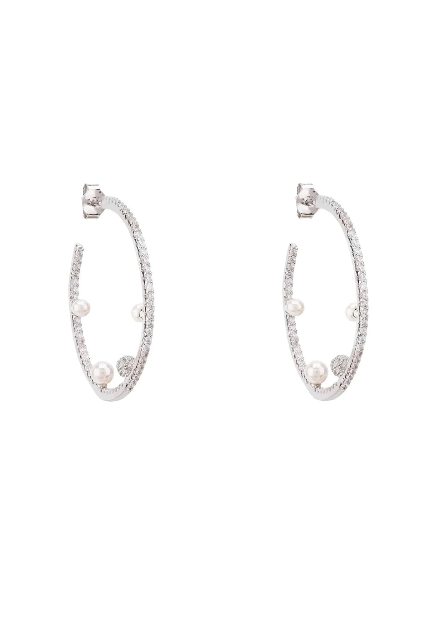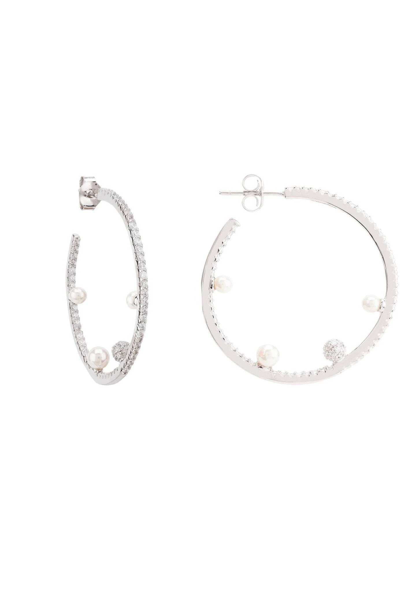 These pretty hoop earrings are stylishly simple. Handcrafted in sterling silver these earrings are decorated around the circumference with sparkling zircons with small white pearls along the front edge.