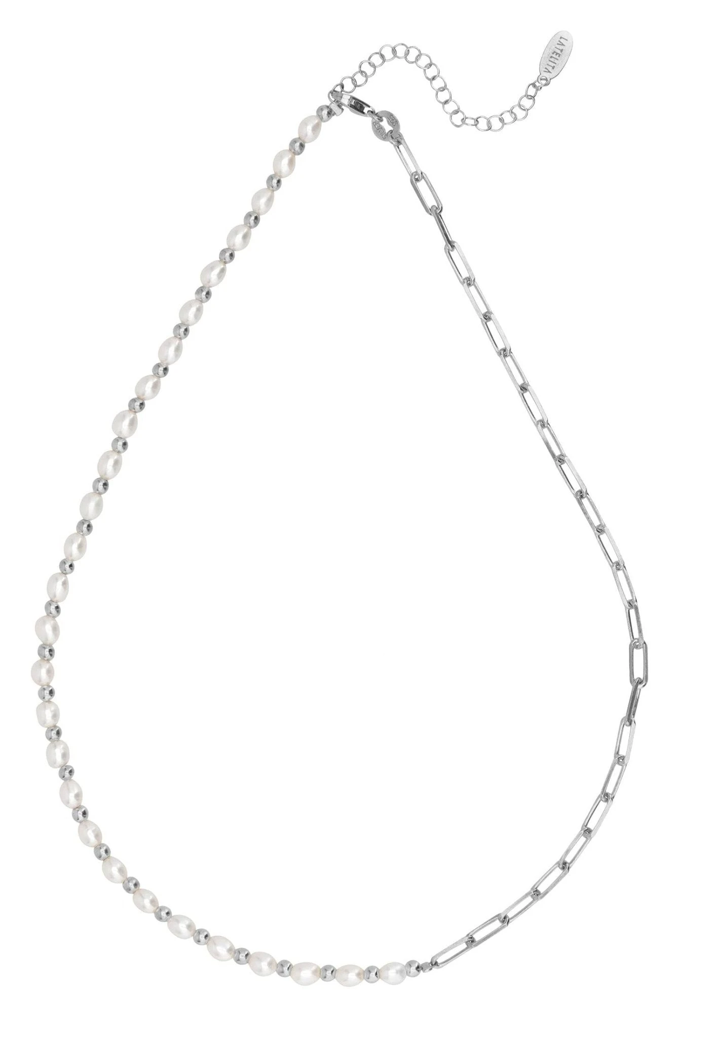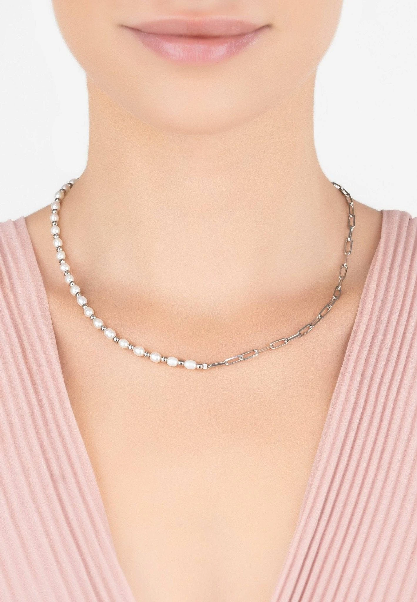 Let the petite pearl strand necklace be your new wardrobe staple. Ideal for those who love delicate jewellery. To the front aspect of this adorable choker style necklace, lay a single strand of small white pearls with metallic beads in-between. The back has been left as a length of paperclip chain.