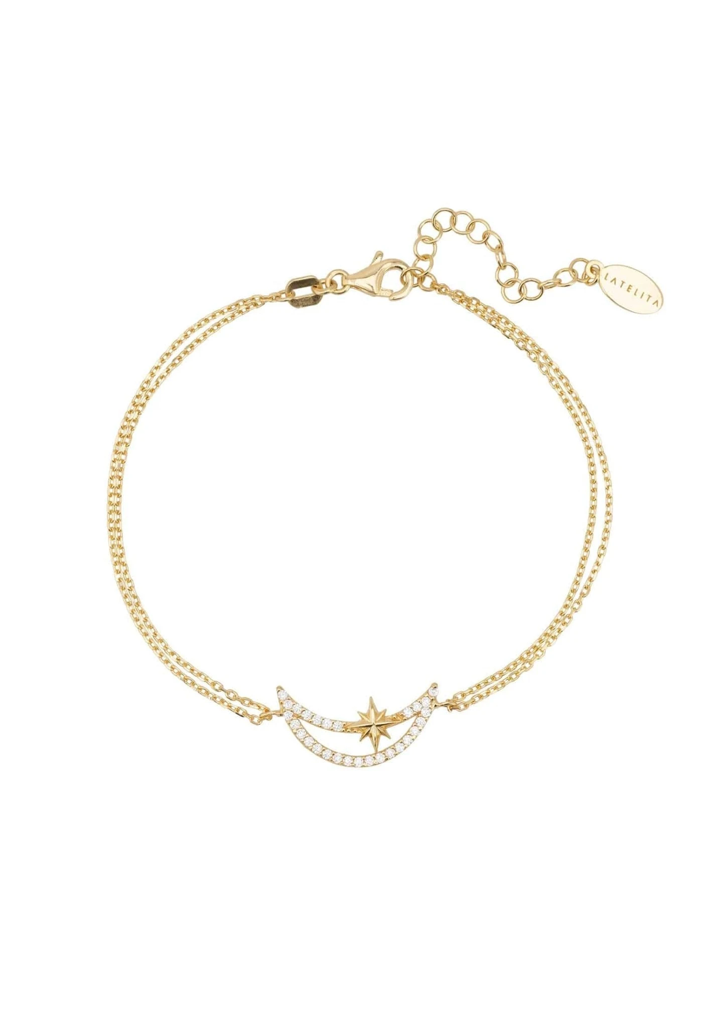 Introducing our Sparkling Crescent Moon and Star Bracelet, perfect for everyday styling. The open crescent moon motif is outlined using Latelita London white zircons to provide dazzling sparkle from day to night. Either worn singularly or layered for a more dramatic look, this bracelet is a must-have for those who adore delicate jewellery with a touch of sparkle.
