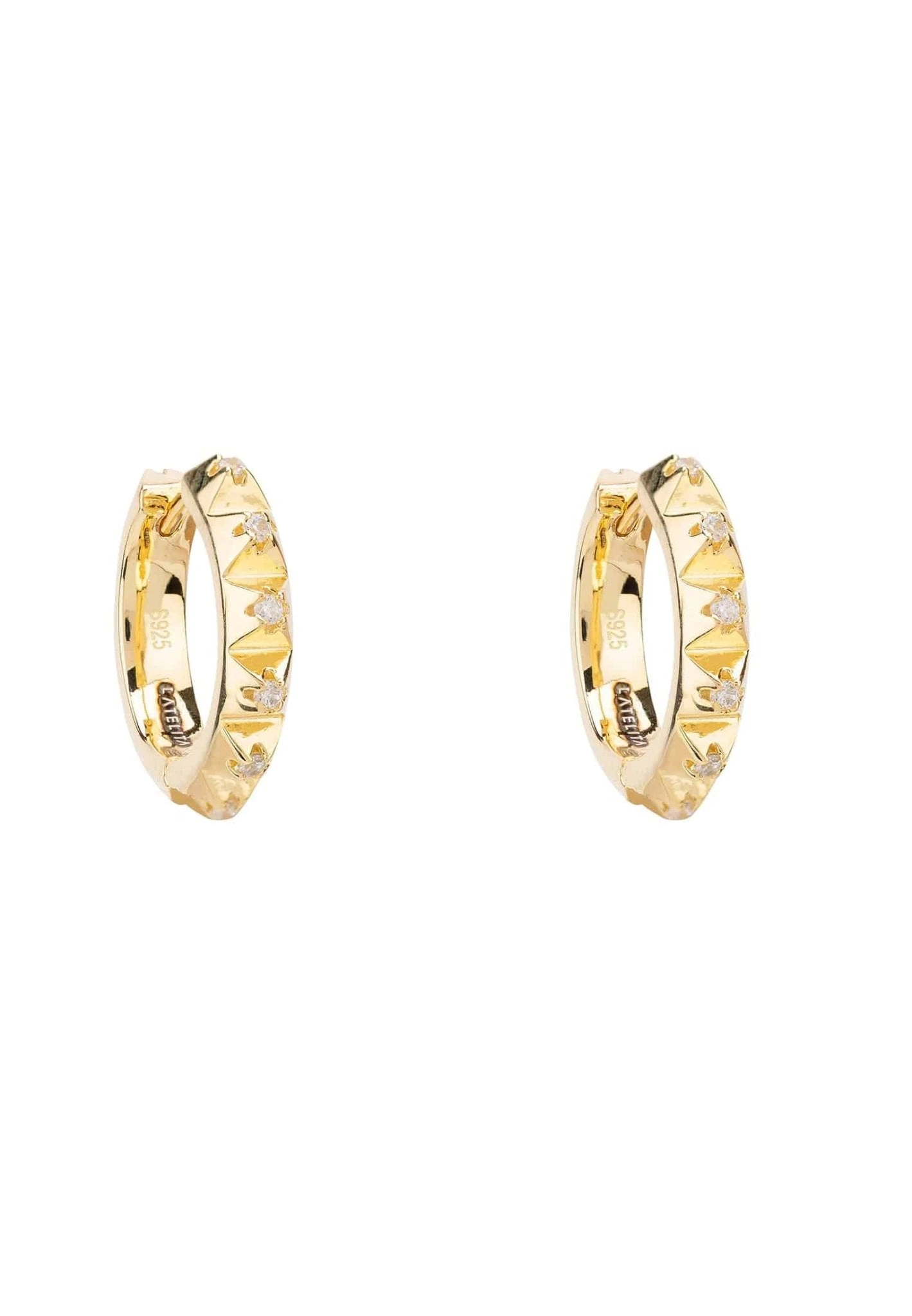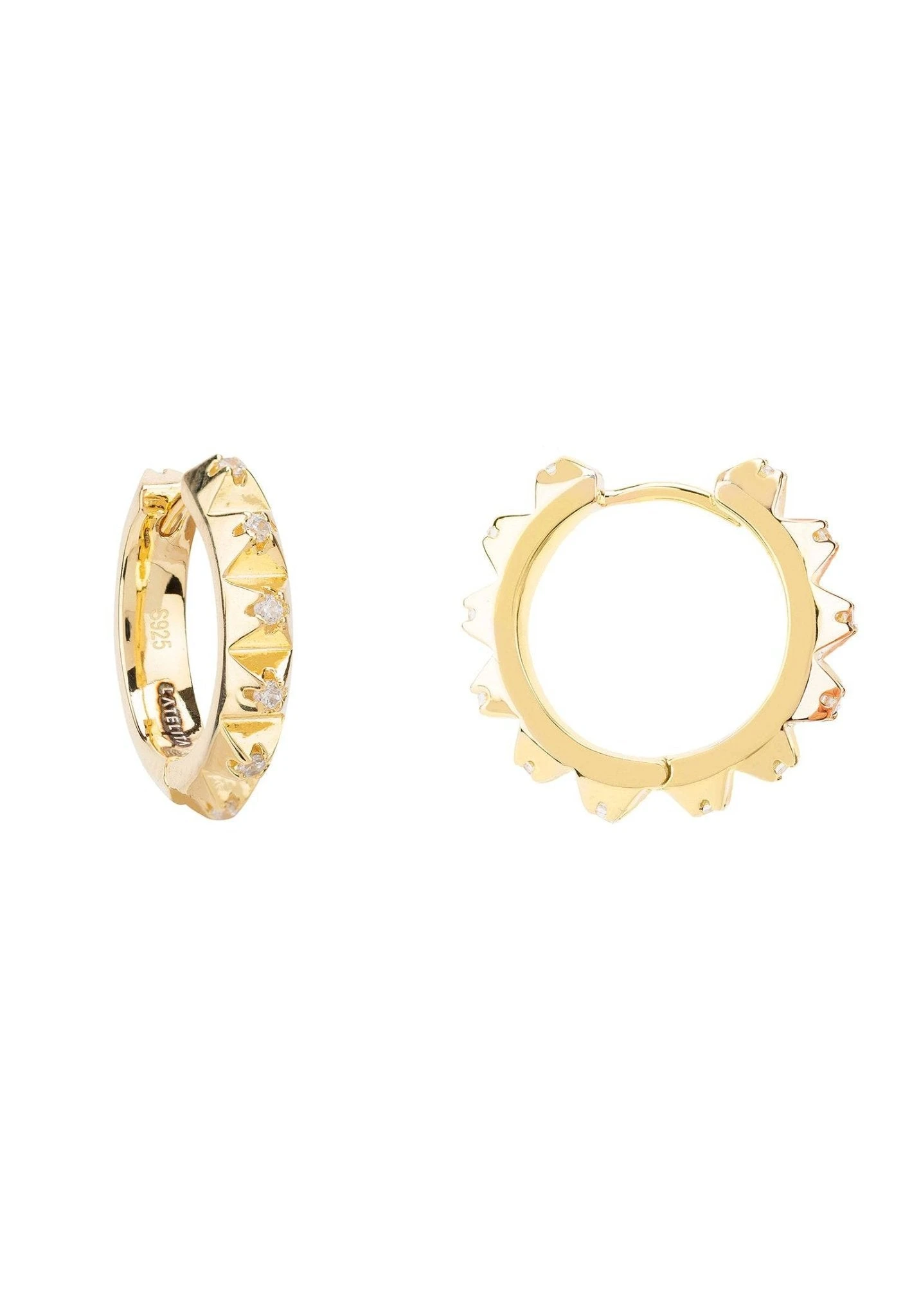Hand crafted in sterling silver, these chunky hoop earrings have a spikey outer edge with a sparkling zircon set at each point. These small spikey hoops hug the bottom of the ear when worn and are hinged making these hoops easy to put in and take out.