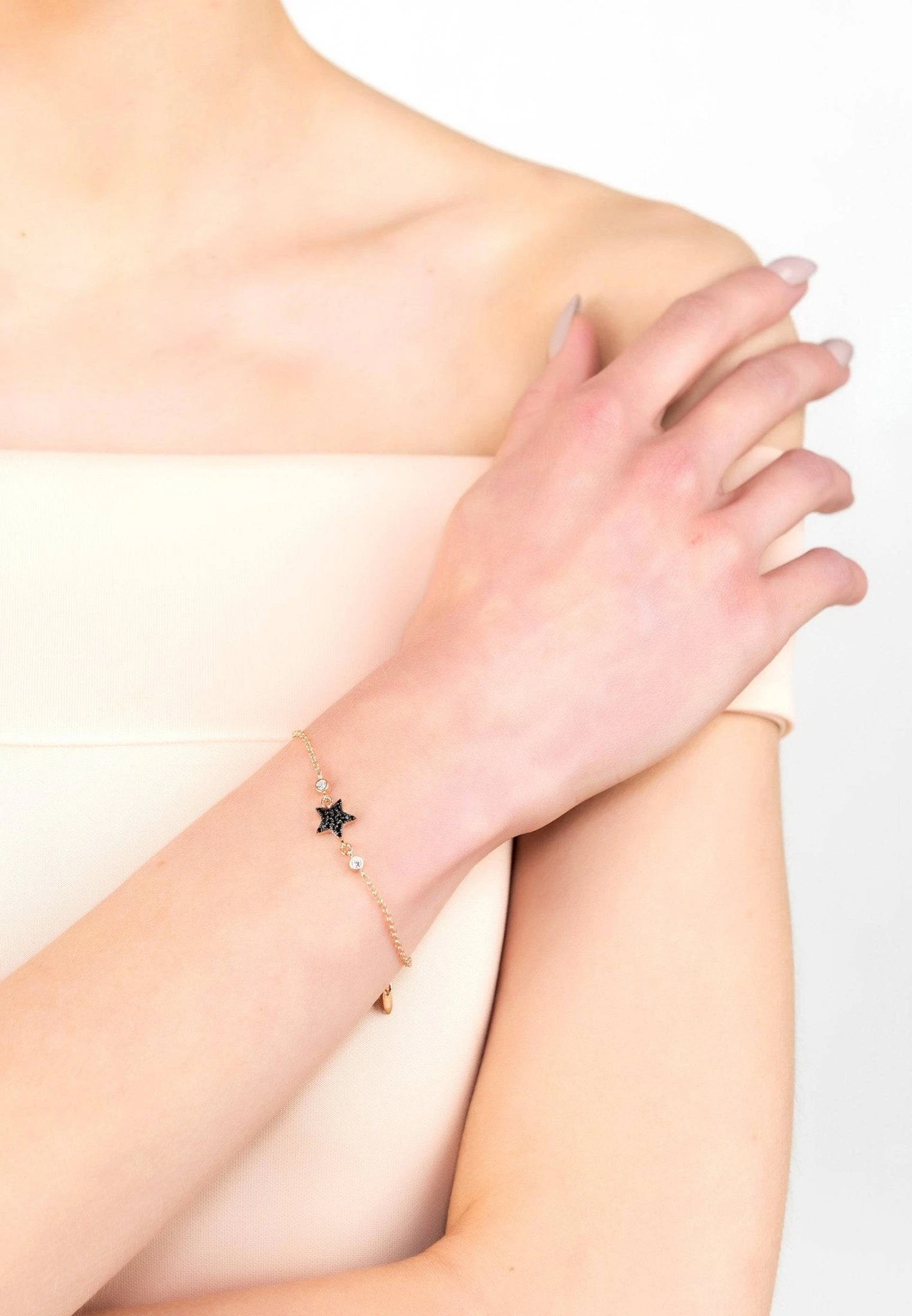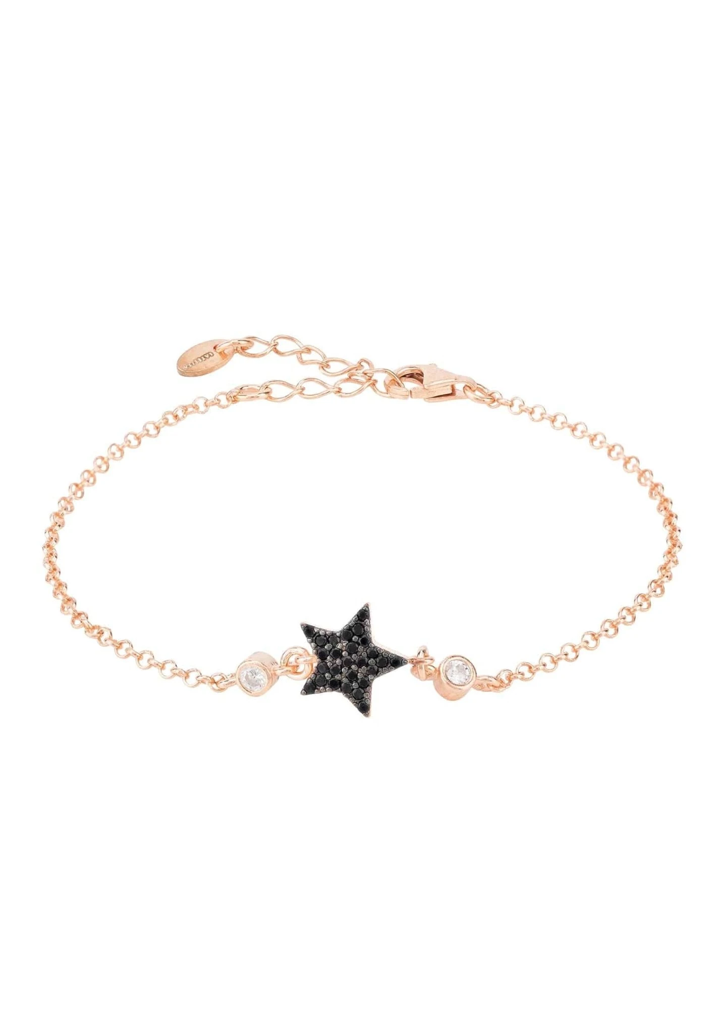 Great for everyday styling, this pretty star lucky bracelet features a dainty zircon adorned star, on a fine chain, framed either side by a single white zircon for added sparkle, with lobster clasp fastening.