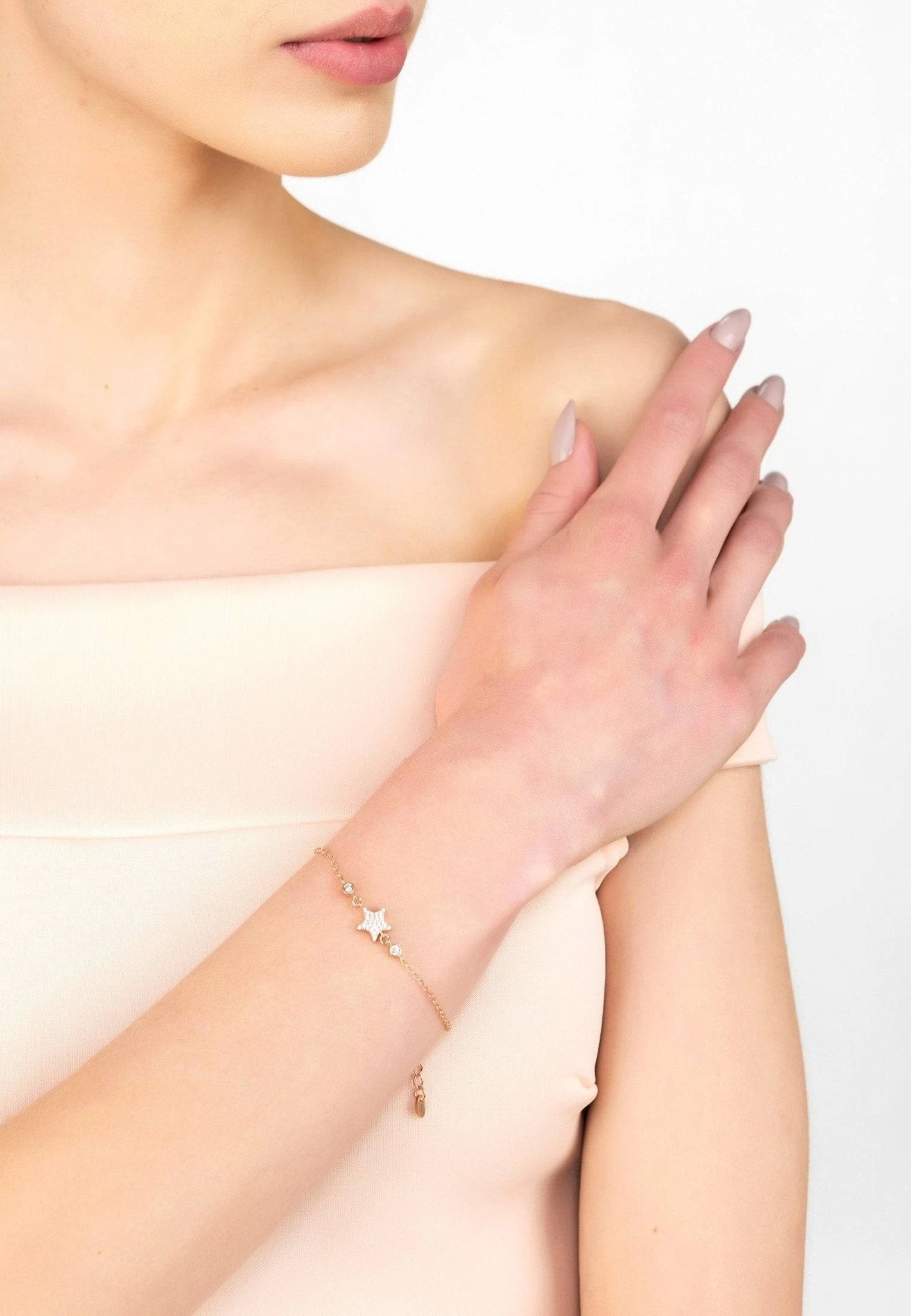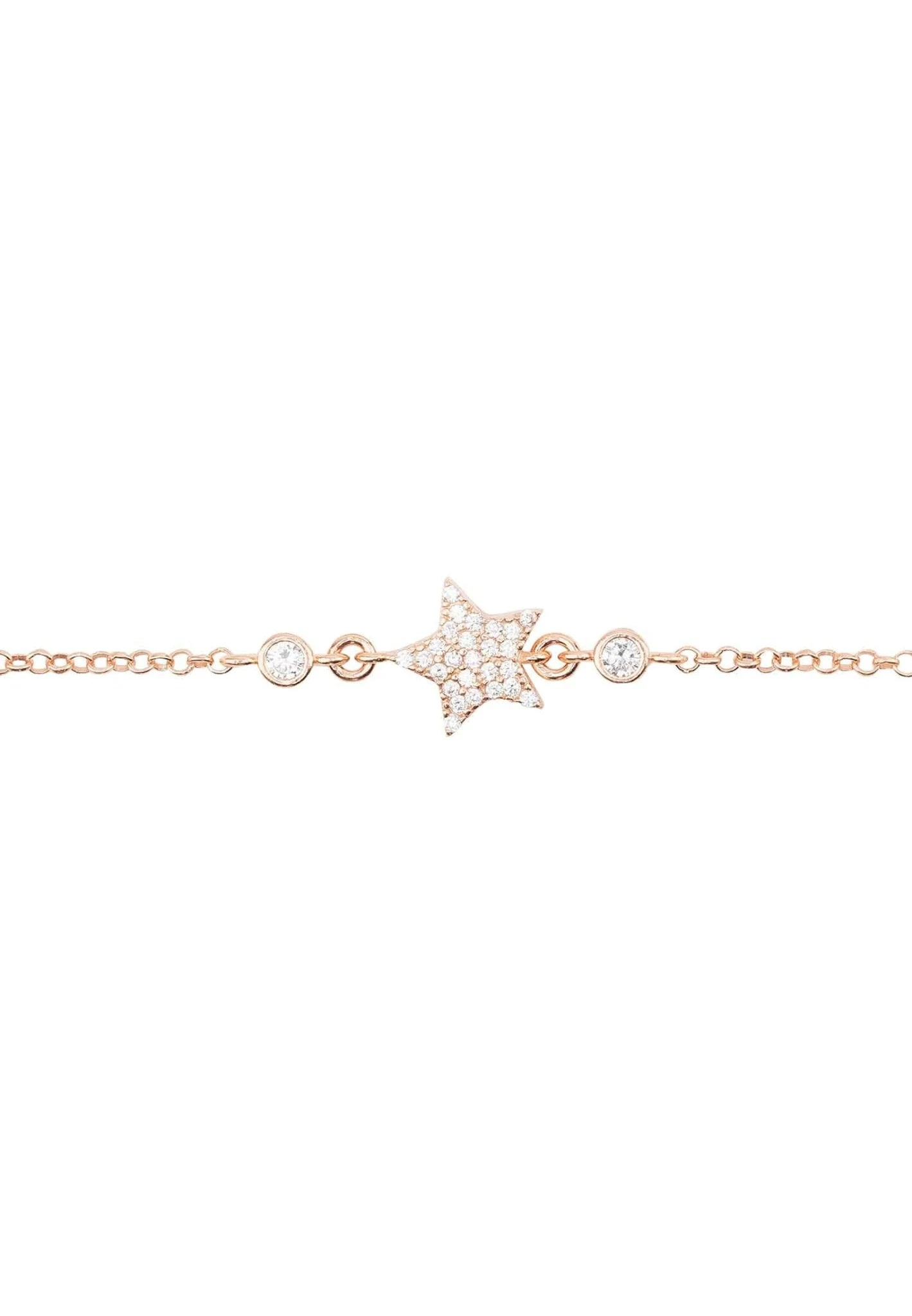 Great for everyday styling, this pretty star lucky bracelet features a dainty zircon adorned star, on a fine chain, framed either side by a single white zircon for added sparkle, with lobster clasp fastening.