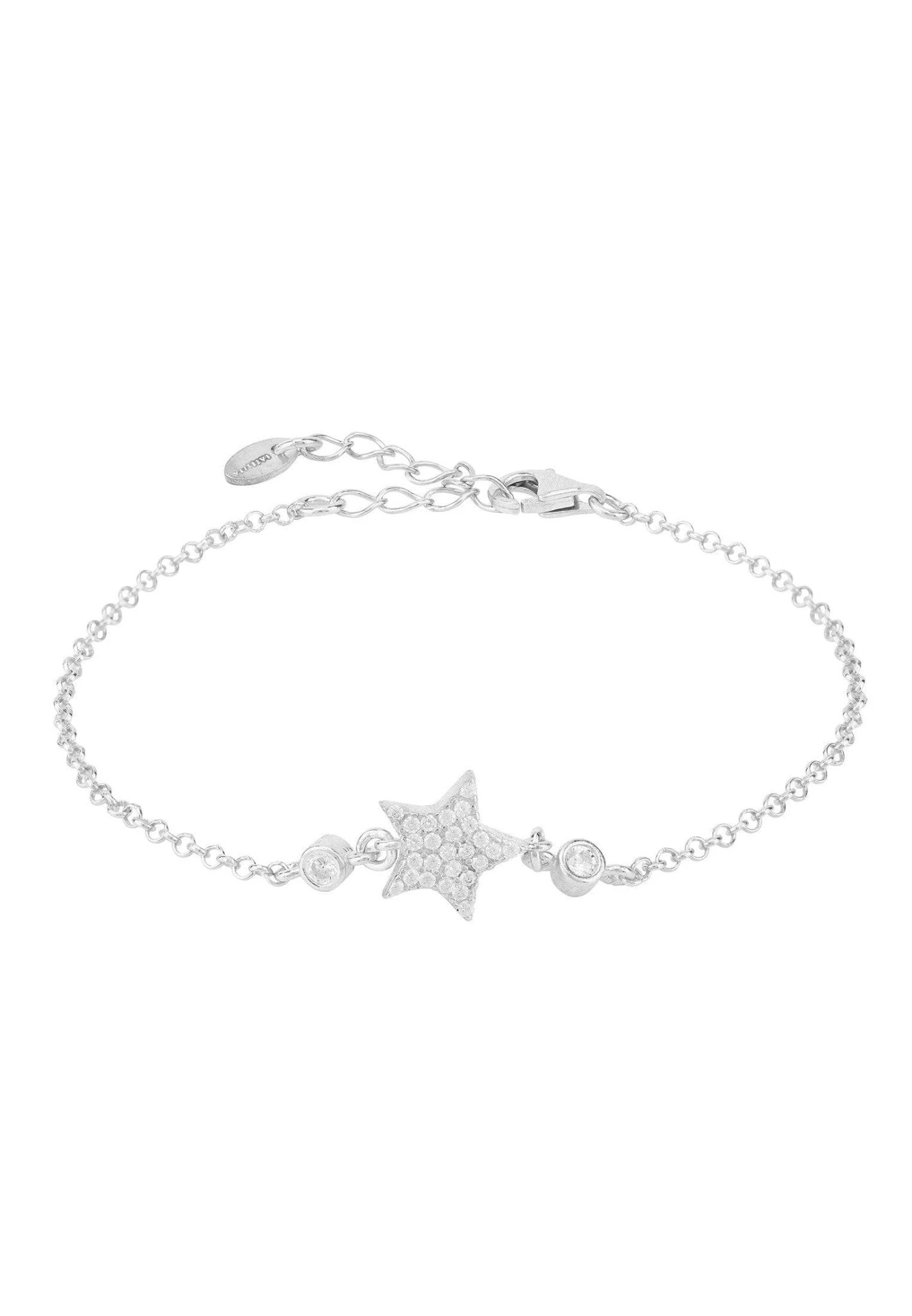 Great for everyday styling, this pretty star lucky bracelet features a dainty zircon adorned star, on a fine chain, framed either side by a single white zircon for added sparkle, with lobster clasp fastening.