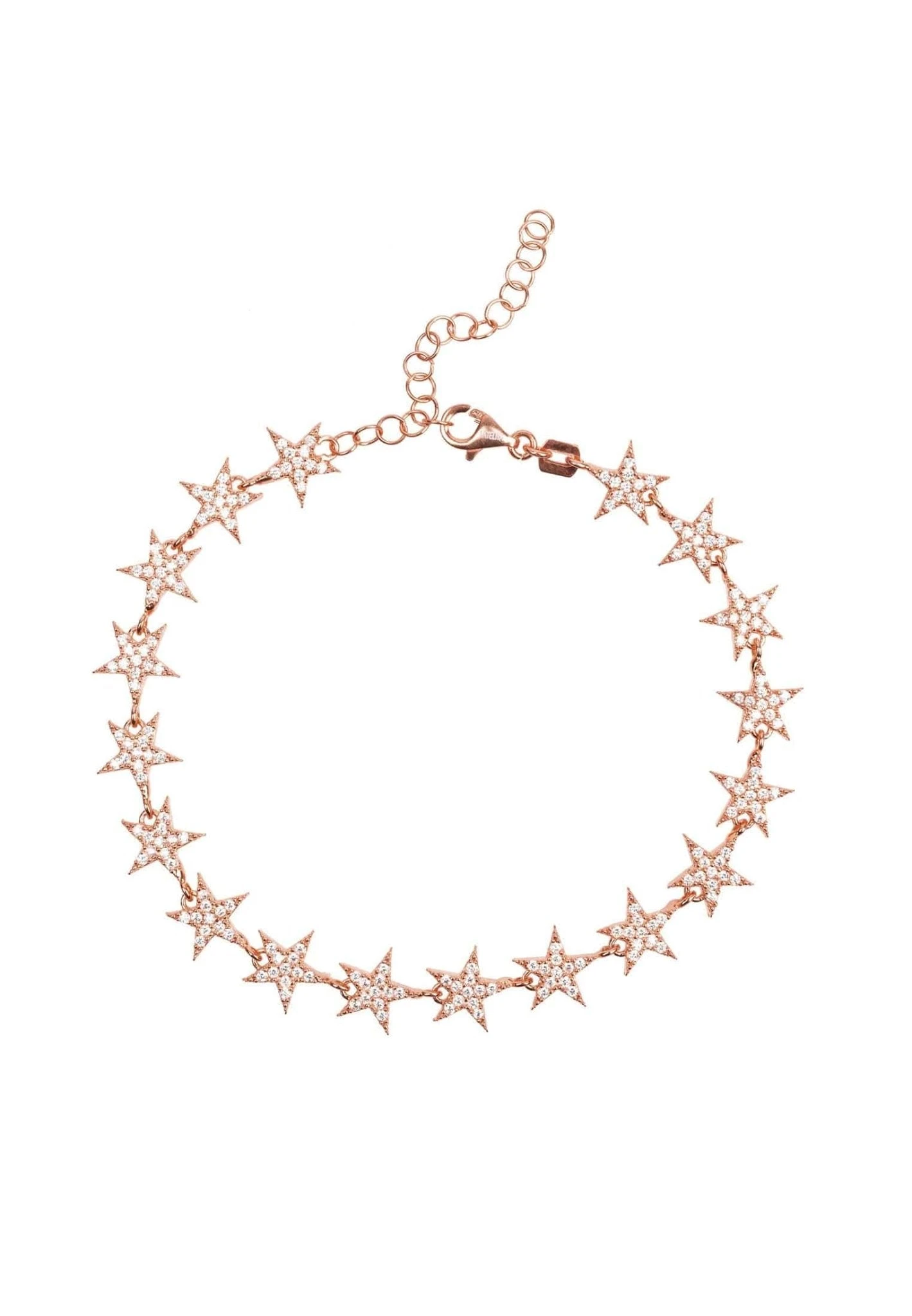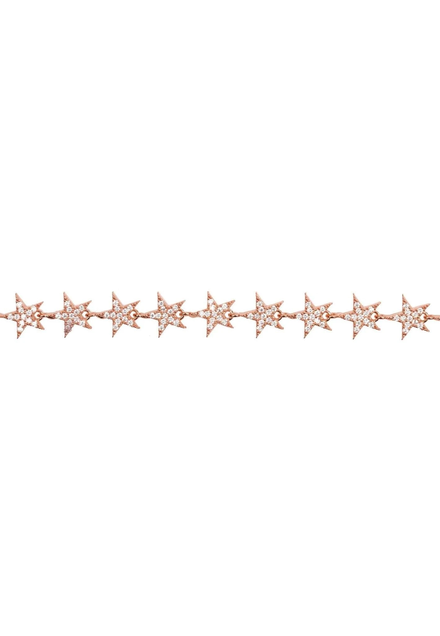 Crafted from glimmering sterling silver and dipped in luxurious 22 carat rosegold, this exquisite bracelet boasts a dazzling row of white zircon adorned stars. Its alluring lustre makes it an ideal accessory for any bride-to-be or simply as an elegant highlight to complete your desired look!